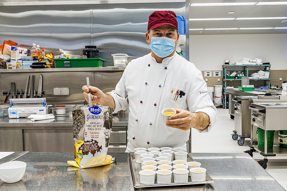 «Bevor wir uns für die Hero Origine Konfitüre entschieden haben, führten wir einen Blindtest mit verschiedenen Sorten durch», sagt Marcel Coray. «Uns überzeugte der hohe Fruchtanteil, der intensive Geschmack und die satte Farbe bei den Hero Origine Konfi-Sorten.» Der Gastronomiebetrieb des Spitals arbeitet seit 15 Jahren mit Hero zusammen. «Nebst den Konfitüren haben wir noch das Apfelmus von Hero Origine. Und natürlich noch viele andere Produkte wie Teigwaren, Tomatenprodukte und Kompottfrüchte, die wir bei uns in der Küche täglich verwenden», betont Marcel Coray gegenüber GOURMET. Mit Hero Aussendienstmitarbeiter Adrian xy trifft er sich viermal pro Jahr. «Wir pflegen eine enge und freundschaftliche Partnerschaft. Dem Küchenteam stehe ich auch immer wieder beratend zur Seite», erklärt Adrian Demont, ausgebildeter Bäcker und Konditor und seit elf Jahren für die Hero im Einsatz. Diese langjährige Partnerschaft ist für alle Beteiligten eine Win-Win-Situation. Die Spitalgastronomie des Kantonsspital Graubünden schliesst mit Hero mittel- bis langfristige Vereinbarungen ab. Das gibt den Hero Origine-Bauern eine wichtige Planungssicherheit. Und den Patientinnen und Patienten die Garantie für feinste Konfitüre aus Schweizer Früchten.
