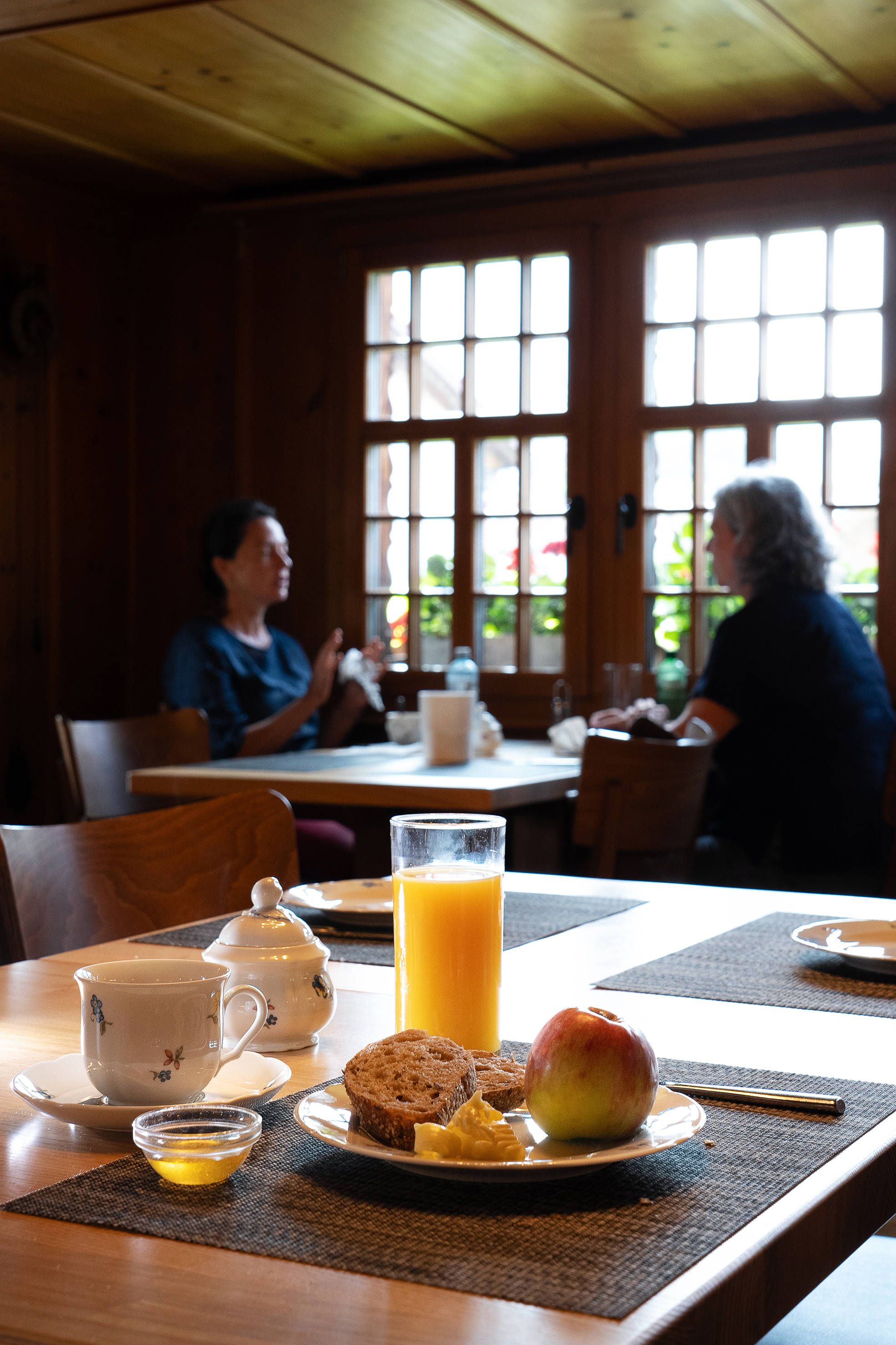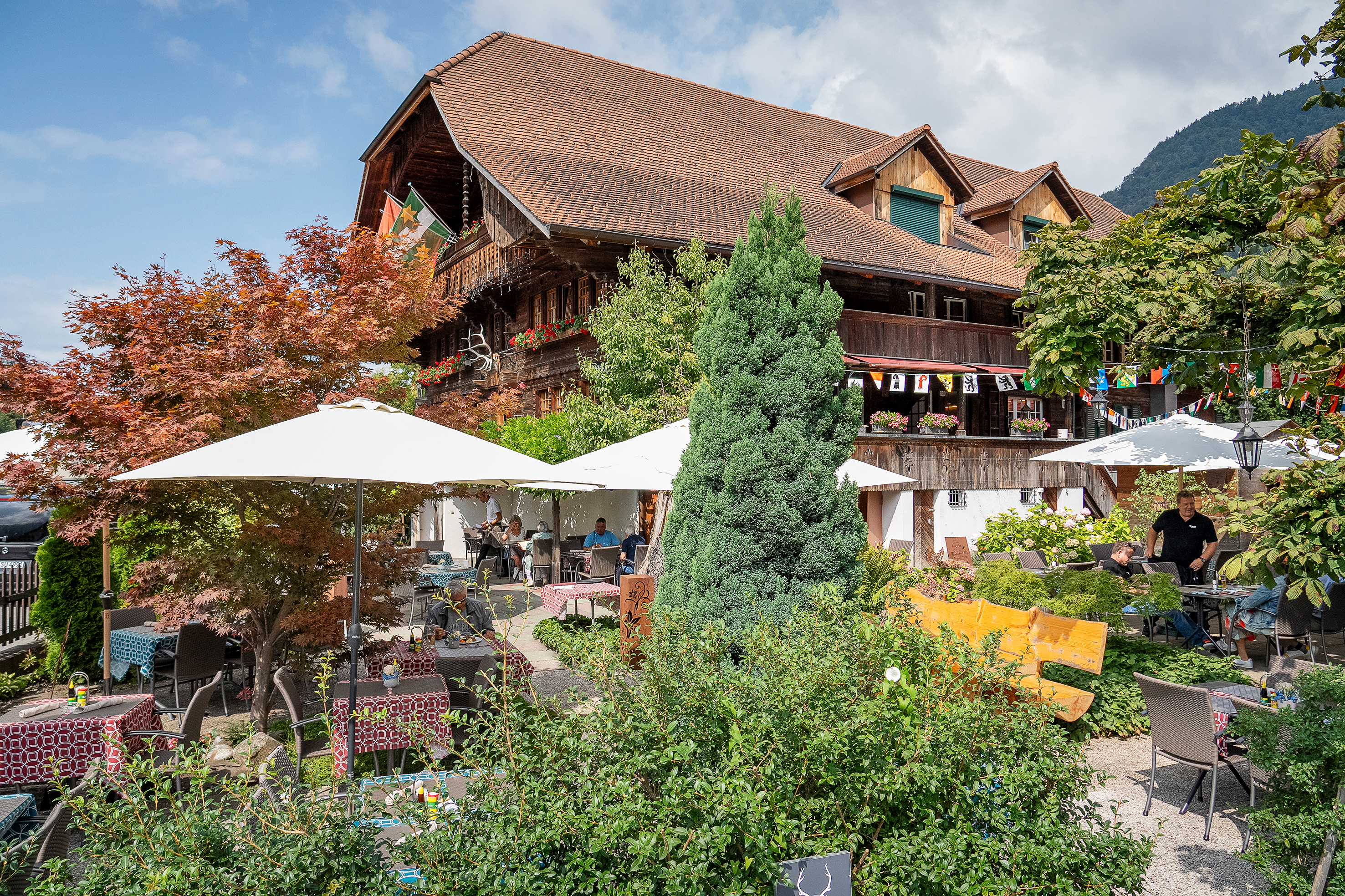 Die 20 Zimmer sind individuell im Chalet-Stil eingerichtet. Die tiefen Holzdecken erinnern an die über 300 Jahre alte Geschichte des Hauses, ebenso die Butzenfenster. Auch gehört eine gemütliche Ferienwohnung für bis zu sechs Personen, die sich in unmittelbarer Nähe befindet, zum Hotel. Der Hotelempfang mit Frühstücksbereich und Aufenthaltsraum im oberen Stock wurden erst im letzten Jahr komplett umgestaltet. Modern. Und doch so, dass es mit der alten Struktur harmoniert. Auch der Weinkeller unter schön geschwungenem Gewölbe ist komplett neu gestaltet. Hier lässt sich so manch edler Tropfen angenehm verkosten. In der Gaststube und im Stübli spürt man die Geschichte des Hauses noch gut. Liebevoll urchig eingerichtet, fühlt man sich hier einfach wohl. Bei schönem Wetter jedoch, will man draussen im Garten sitzen. Die Bäume spenden angenehm Schatten, man ist umgeben von viel Grün. Hier lässt man es sich gutgehen und geniesst die traditionelle Schweizer Küche. Fondue und Rösti, zartes Filet auf heissem Stein, geschnetzeltes Kalbfleisch nach Zürcher Art, um einige Beispiele zu nennen.