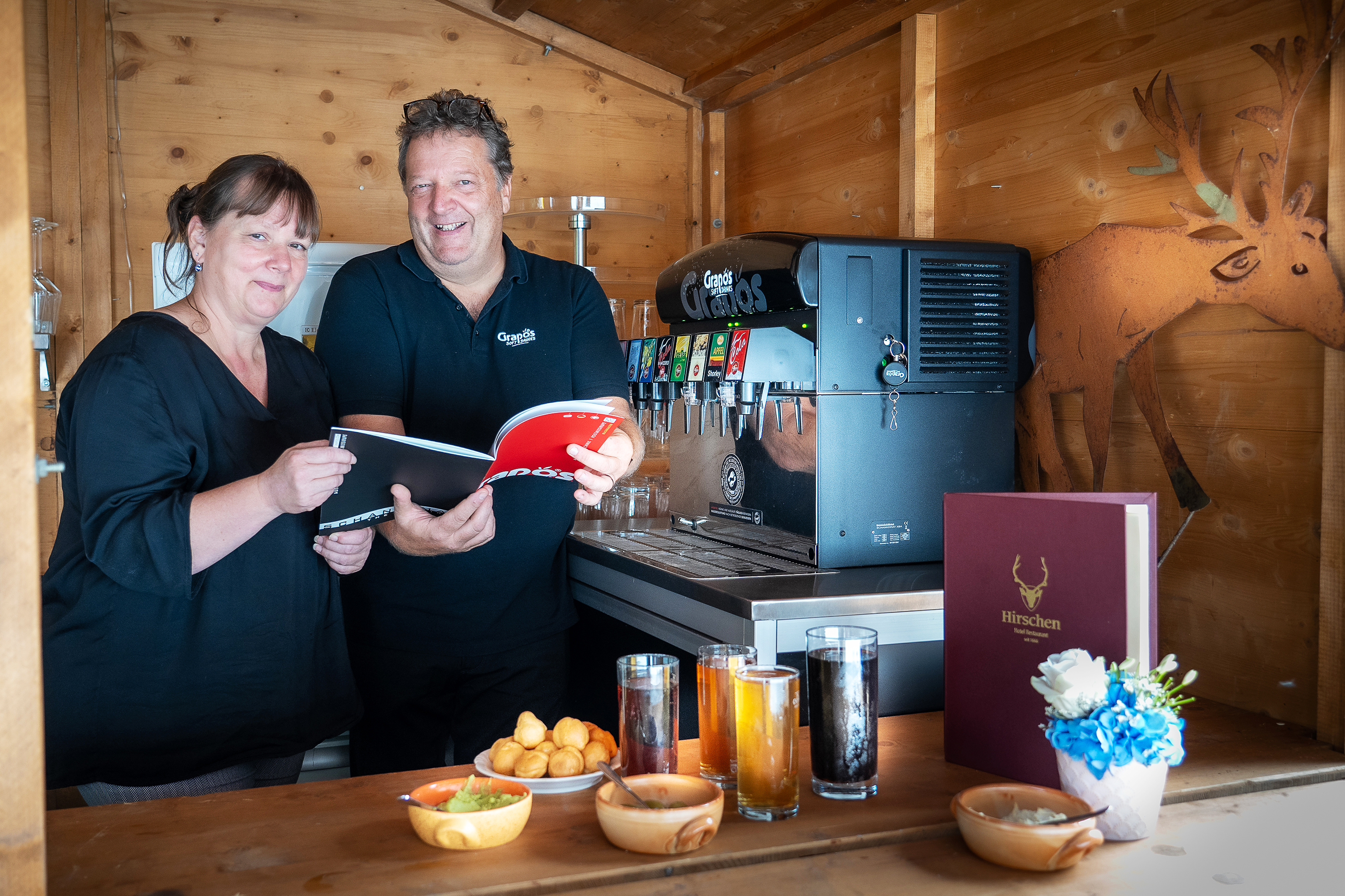 Im Hirschen sind gleich drei Ausschanksysteme von Grapos zu finden. Am Buffet im Restaurant kann das Servicepersonal am Ausschankgerät 14 Produkte beziehen. Es ist sogar möglich, mehrere gleichzeitig ins Glas sprudeln zu lassen. Am Frühstücksbuffet können sich die Hotelgäste mit Fruchtsäften und Wasser selbst am Schankomat bedienen. Und damit es schnell geht, steht ein mobiles Oberthekengerät am Servicepoint der Terrasse. Speziell beim Hirschen ist sicher die Breite der Getränke: «Als gebürtige Deutsche mag ich Fruchtschorlen. Darum dürfen Holunder- und Kirschschorle im Angebot nicht fehlen», lacht Nicole Förderer. Und dann trumpft der Hirschen bald mit einem weiteren Highlight: dem Cocktailer. Von Bacardi-Cola über Tequila-Sunrise und Co. lassen sich darüber viele Cocktails programmieren und ausschenken. «Wir freuen uns schon darauf, damit können wir unseren Gästen echt etwas Besonderes bieten», ist Jacqueline Feuz überzeugt.