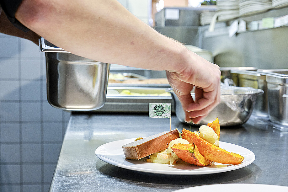 Um den Gästen einen Einblick in dieses Engagement zu vermitteln, führt der ZFV seit 2017 jedes Jahr eine Nachhaltigkeitswoche durch. Ende Oktober 2020 umfasste sie unter anderem zwei besonders nachhaltige Mahlzeiten, mit welchen der «Menu-Nachhaltigkeits-Index» vorgestellt wurde. Mit ihm werden ernährungsphysiologische Ausgewogenheit und Umweltfreundlichkeit von Gerichten anhand zweier Symbole im Speiseplan der ZFV-Gemeinschaftsgastronomie sichtbar gemacht. Zudem wurde ein Food-Waste-Menu – dem ZFV als Gründungsmitglied von «United Against Waste» ein besonderes Anliegen – sowie ein Fairtrade-Max-Havelaar-Menu angeboten. Am fünften Tag dann stand der «Green Mountain»-Fleischkäse im kulinarischen Angebot. Als Weltpremiere! «Schon der ‹Green Mountain›-Burger feierte bei uns Markteinführung. Eine Plattform, die wir gerne bieten, entsprechen solche pflanzlichen Fleischalternativen doch genau unserem Konzept des nachhaltigen Genusses», betont Melanie Weber.