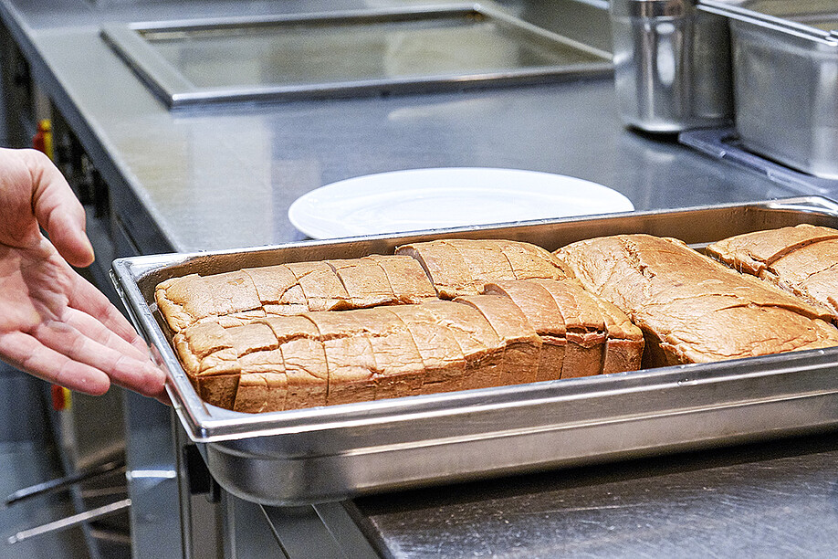 Küchenchef Jérôme Mosbacher hat sich heute für die traditionelle Variante entschieden – und zeigt sich begeistert: «Der Fleischkäse sieht echt aus und ist auch in der Konsistenz perfekt. Nicht zuletzt stimmt auch der Geschmack, welcher dem Original in Nichts nachsteht. Ich kann mir den ‹Green Mountain›-Fleischkäse durchaus als regelmässiges Tagesmenu vorstellen. Zum Beispiel, wenn wir zusätzlich zum Tagesgeschäft Caterings vorzubereiten haben, wie wir sie für ein Zmorge im Büro, für den Lunch während eines Seminars, für den unkomplizierten Apero oder für verschiedenste Feiern anbieten. Dann sind wir jeweils froh um solche Alternativen, die sich einfach zubereiten lassen.» Tatsächlich unterscheidet sich die Zubereitung nicht von einem anderen Fleischkäse: Über Nacht im Kühlschrank auftauen und anschliessend bei 160 Grad im Backofen oder Combisteamer auf 90 Grad Kerntemperatur erhitzen. «Dafür muss man kein Profi sein», sagt der Küchenchef.