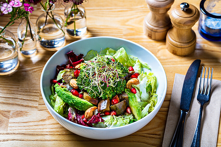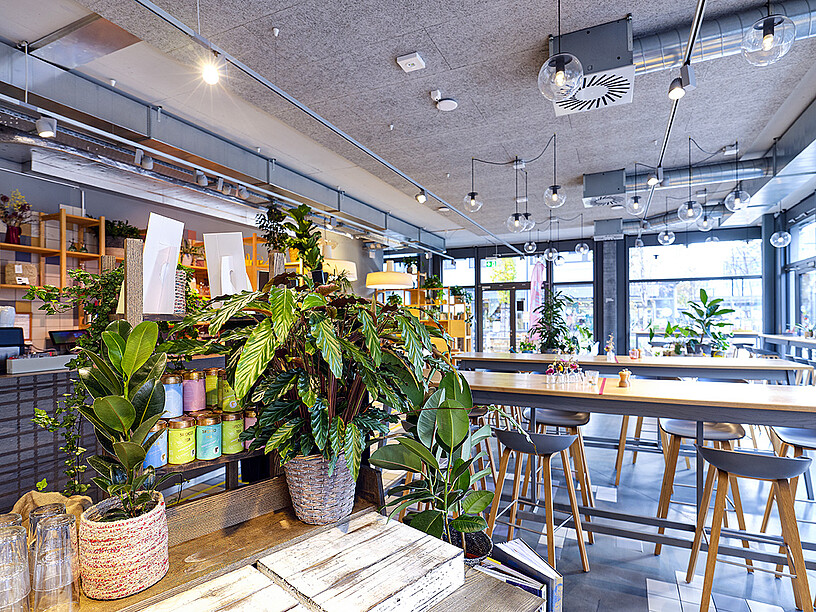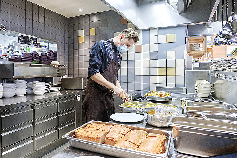 Eine Überzeugung, die auch Jérôme Mosbacher lebt. Er wirkt als Küchenchef im Lilly Jo. Beim Restaurantkonzept, das 2015 vom ZFV ins Leben gerufen wurde und heute in Basel und Zürich in Betrieb ist, nehmen die Themen Ressourcenschonung und Nachhaltigkeit eine besonders tragende Rolle ein. Erzählt wird die Geschichte der fiktiven Lilly Jo, die von ihren Reisen auch viele vegane oder vegetarische Gerichte zurückgebracht hat. «Wir kochen frisch und saisonal, achten auf nachhaltige Produkte, möglichst von regionalen Lieferanten.» 60 Sitzplätze bietet das «Wohnzimmer von Lilly Jo», fast gleich viele im Freien. Bis zu 300 Gerichte servierte man hier vor Corona täglich, viele auch im Take-away – «aktuell sind es noch rund ein Drittel davon. Auch weil unsere Gäste zum grossen Teil aus Geschäftsleuten bestehen, die sich hier über Mittag verpflegen», sagt Larissa Wegmüller, Betriebsassistentin im Lilly Jo Zürich. «Wir bieten nebst einem Free-Choice-Buffet zwei Tagesmenus an, davon ein veganes. Das ist meist gefragter. Nicht nur bei Veganern, sondern schlicht auch bei Personen, die sich bewusster und umweltfreundlicher verpflegen wollen.» Gerade deshalb sind für Küchenchef Jérôme Mosbacher pflanzenbasierte Fleischalternativen optimal: «Sie sind für mich eine gute Option für Abwechslung in der Menuplanung. Und für Flexitarier eine willkommene Möglichkeit, nachhaltiger zu konsumieren, ohne dass sie verzichten müssen. So kommt auch der ‹Green Mountain›-Burger bei uns immer sehr gut an.»