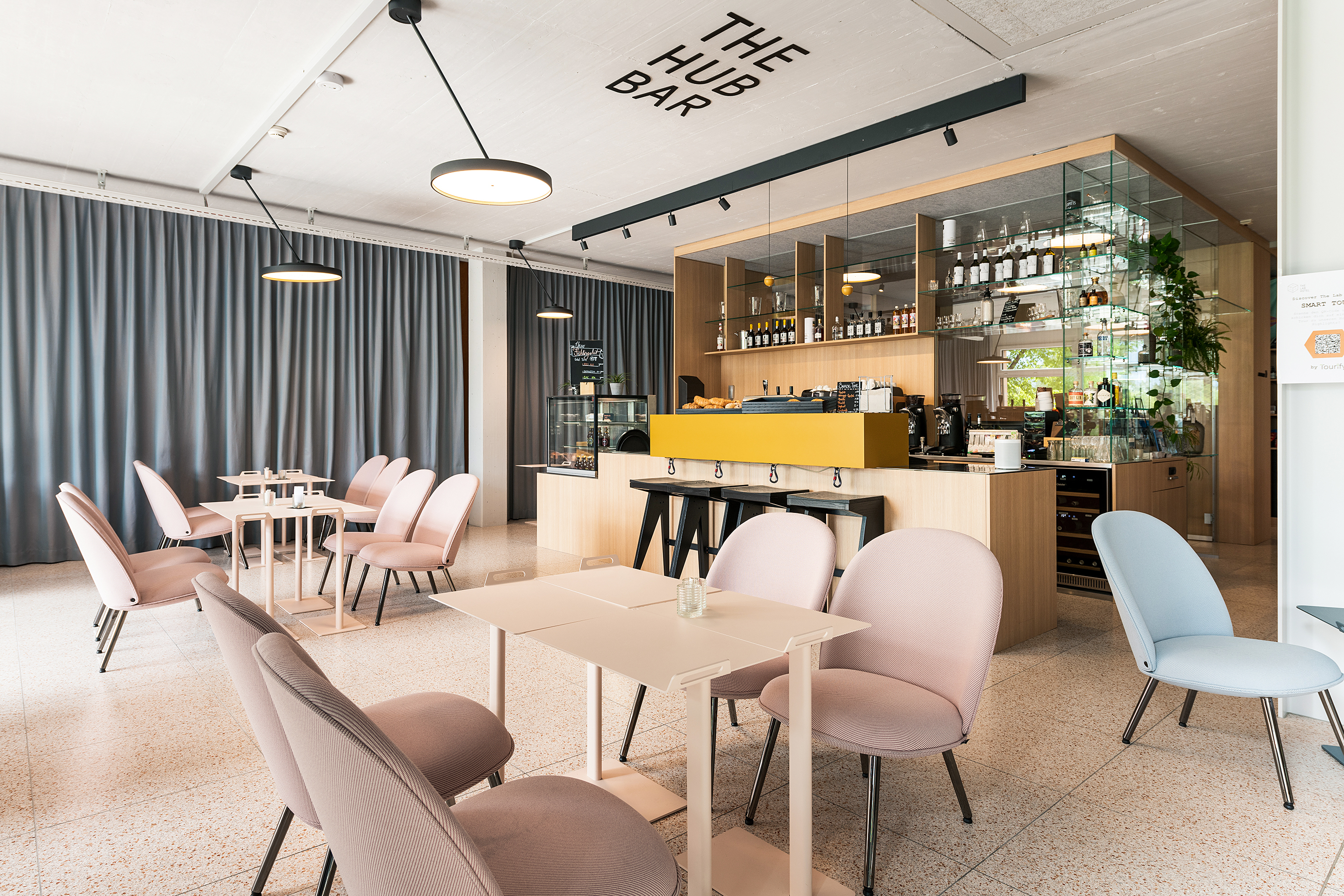 Eine Schule mit Hotellobby, in der E-Bikes, SUPs und ein E-Tuk-Tuk vermietet werden. Hier befinden sich Work Spaces, eine Café-Bar (The Hub Bar) und im hinteren Bereich das Restaurant Food Market mit rund 180 Innen- und weiteren 60 Aussenplätzen. Das öffentliche Free-Flow-Restaurant bietet von Montag bis Freitag täglich wechselnde und frisch zubereitete 3-Gang-Lunch-Buffets. Stühle in knalligem Orange setzen Akzente und grosse Tische fördern die Geselligkeit. Ein Treffpunkt für Hotelgäste, Tagestouristinnen und Studierende.