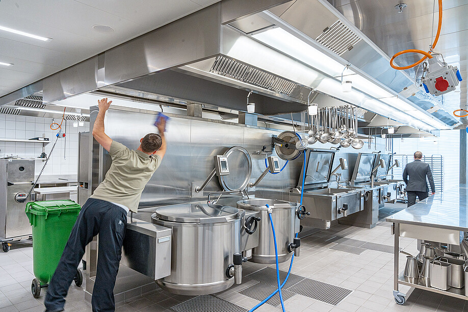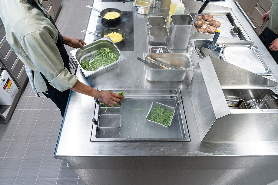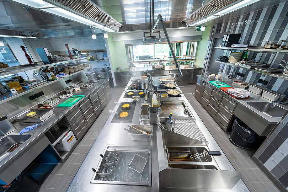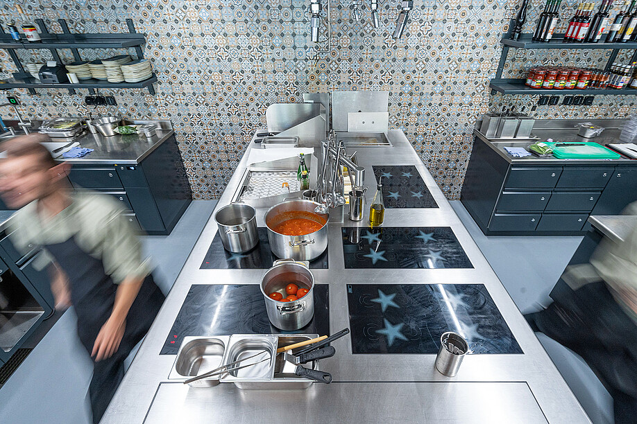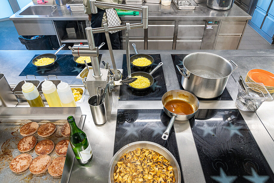 - je ein Multikocher, Fritteuse, Hartchrom-Grill, Kühlwanne, Warmhalteplatte sowie Backofen, Cook&Hold-Schublade, Wärmeschränke und Stauflächen im Unterbau