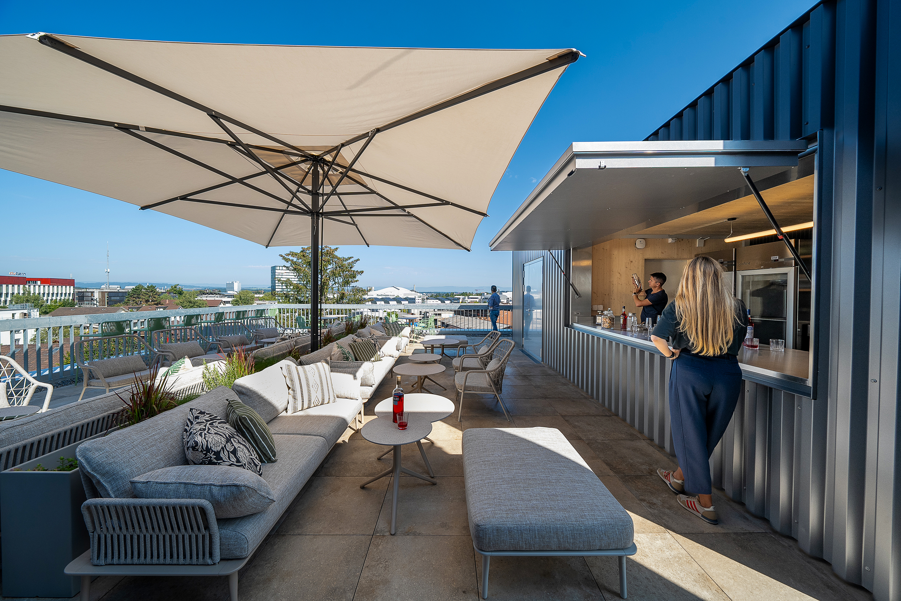 Ergänzt wird das gastronomische Angebot durch eine elegante Kaffeebar. Auf dem Rooftop eröffnet sich den Gästen ein atemberaubender Panoramablick über die Stadt und das Umland. Allein dieser Ausblick ist einen Besuch wert.