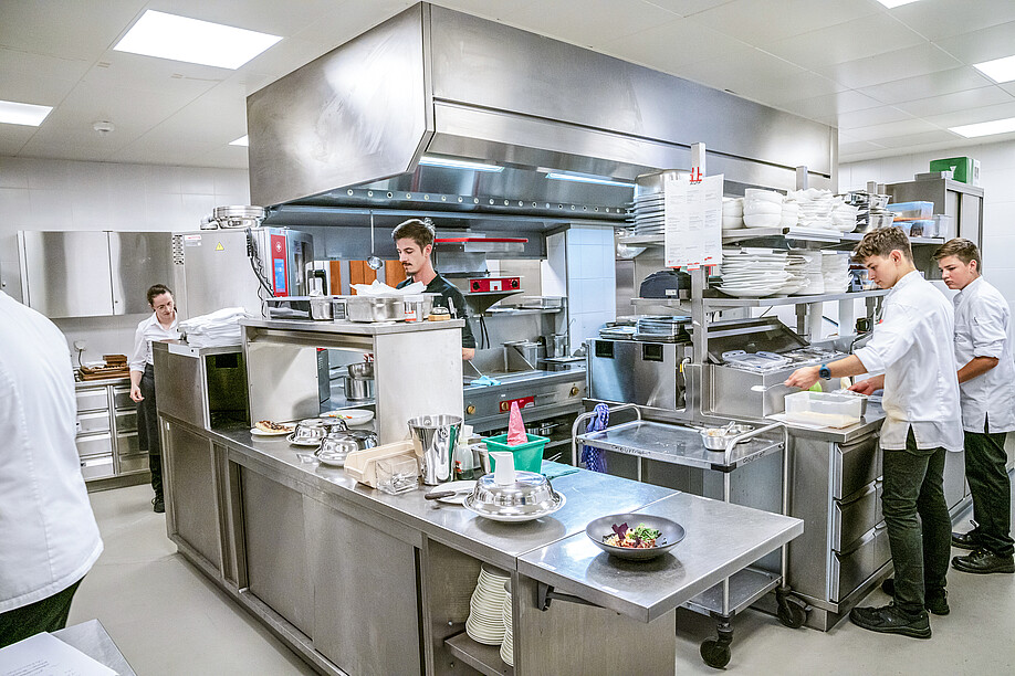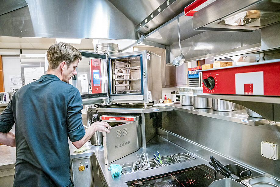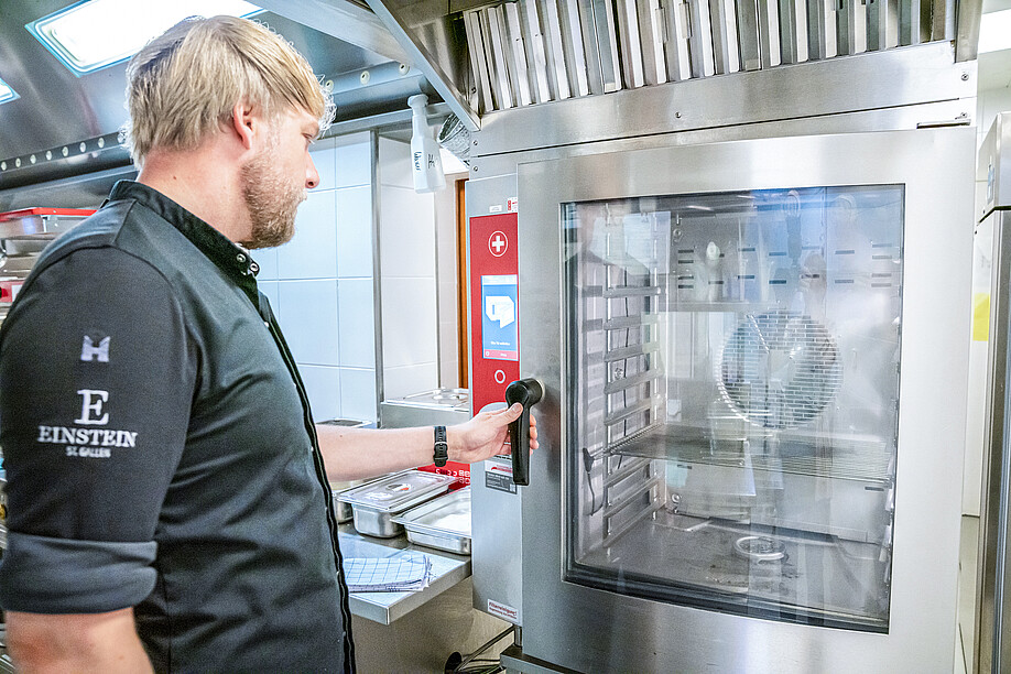 Seit einigen Monaten nun stehen auch in der Einstein-Produktionsküche vier Kombisteamer Practico Vision Plus in verschiedenen Grössen (einmal 6 x 1/1 GN, einmal 20 x 1/1 GN sowie zweimal 10 x 1/1 GN) im Einsatz. «Wir haben zwei Offerten für neue Kombisteamer eingeholt und uns letztlich für Hugentobler entschieden — zum einen, weil wir sehr zufrieden waren mit der bisherigen Zusammenarbeit, zum anderen, weil sich die Kombisteamer in der Bistroküche bewährt haben», betont General Manager Michael Vogt vom Einstein. Dass dabei zehn Prozent der Investitionskosten durch das Förderprogramm EcoGastro übernommen wurden, ist nur eine von vielen positiven Eigenschaften der Practico Vision Plus der Hugentobler Schweizer Kochsysteme AG: