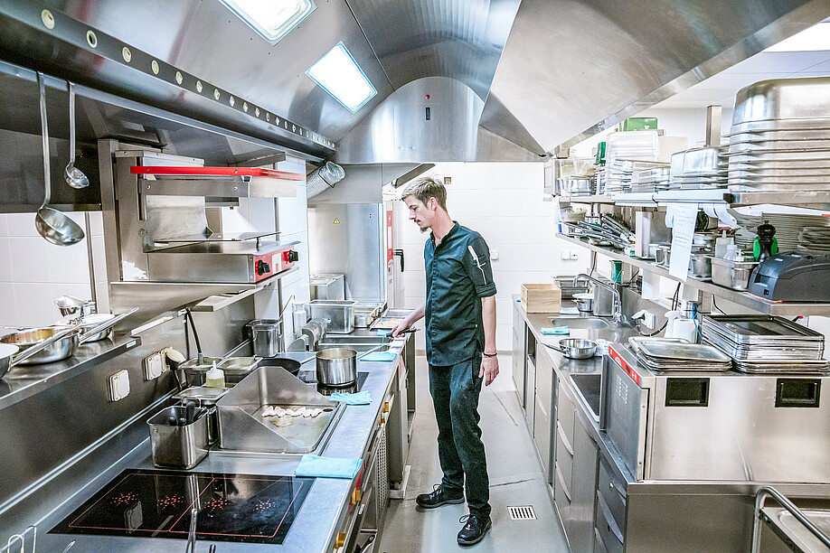 Unter den neuen Gerätschaften der Bistroküche finden sich auch zwei Practico Vision Plus Kombisteamer in den Grössen 6 x 2/3 GN sowie 10 x 1/1 GN. «Wir haben bewusst zwei Kombisteamer in unterschiedlicher Grösse empfohlen, um zwei Klimas zu haben und bei unterschiedlichen Volumen passgenau und damit nachhaltig arbeiten zu können», führt Reto Emmenegger von Hugentobler aus. «Das entspricht genau unserem Bedürfnis», bestätigt Bistro-Küchenchef Max Marte. «So können wir beispielsweise in einem Gerät die vorproduzierten Rösti regenerieren und im anderen die Bratwürste dazu.» Max Marte wurde vor rund drei Jahren von Executive Chef Sebastian Zier ins Einstein-Boot geholt, der ihn schon von früheren gemeinsamen Arbeitsstellen kannte. Als Küchenchef Bistro St.Gallen und Einstein Congress leitet er das rund 20-köpfige Küchenteam für das Bistro, aber auch die grosse Produktionsküche eine Etage darüber. Hier werden einzelne Komponenten für die Bistro-Gerichte vorbereitet, vor allem aber auch die gesamte Verpflegung rund um das Seminar- und Bankettwesen sowie rund um die Familien-Events zubereitet. «Das sind monatlich rund 3500 bis 4500 Mahlzeiten, von unseren Bankett-Menus bis hin zu warmen und kalten Komponenten für Aperos wie Olmabratwurst, Risotto oder Ravioli im Miniformat.»