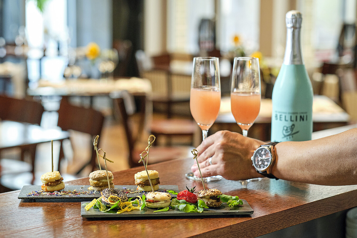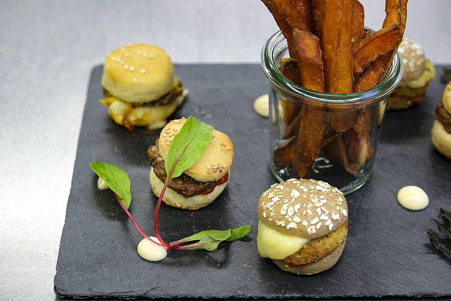 Entsprechend beliebt sind die Mini Produkte der Delico AG. Zum Beispiel Mini Pizza Margherita, Mini Flammkuchen oder Bruschetta Tomaten. Sie alle werden ebenfalls im Karton mit 27 bis 36 Stück geliefert und müssen vor dem Einsatz nur noch kurz aufgebacken werden. Besonders gefragt sind zudem die Mini Burger, die ebenfalls nach wenigen Minuten aufwärmen servier- und genussbereit sind. In den Varianten Classic und Cheese mit feinstem Schweizer Rindfleisch sowie vegetarisch mit einem Falafel-Patty lassen sie jedes Burger-Herz höher schlagen. «Argumente wie ‚Schweizer Fleisch’, aber auch die Tatsache, dass sie kein Palmöl enthalten, werden bei den Gästen immer wichtiger», betont Donato Capuano. «Alles in allem lässt sich mit wenig Aufwand ein Buffet aufbauen, das von Pizza über Burger bis hin zu Bagels jedermanns Lieblingsprodukte aus aller Welt bereithält und mit den Mini Formaten erst noch für grosse Augen sorgt», sagt Product Manager Thomas Hartmann zu GOURMET.