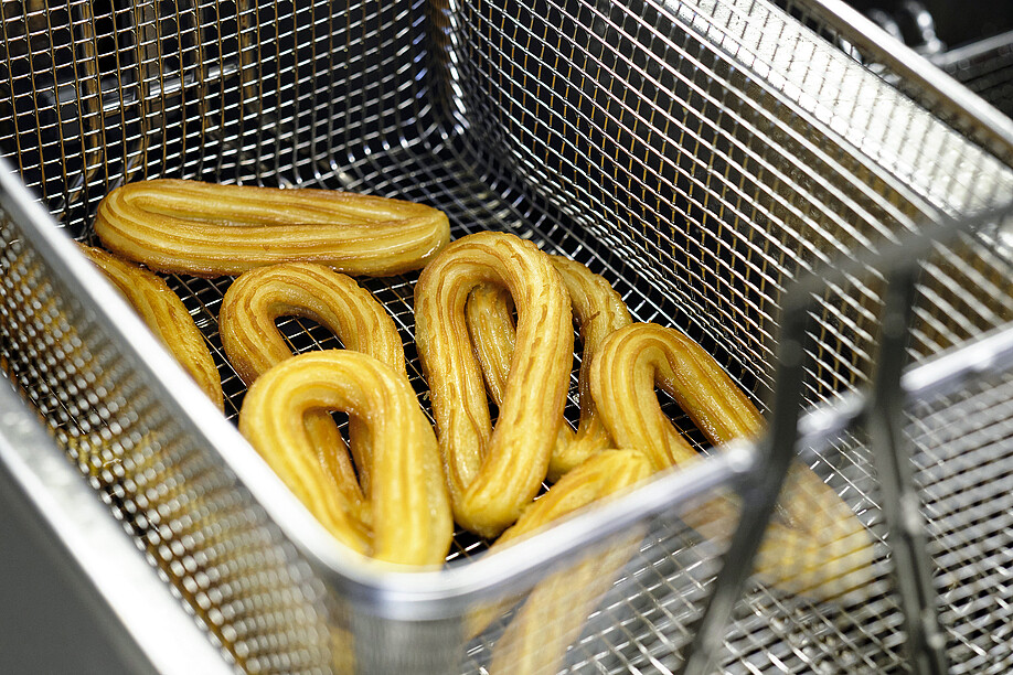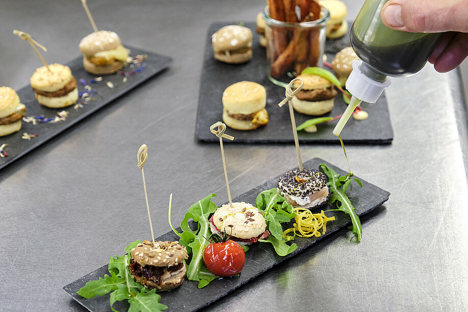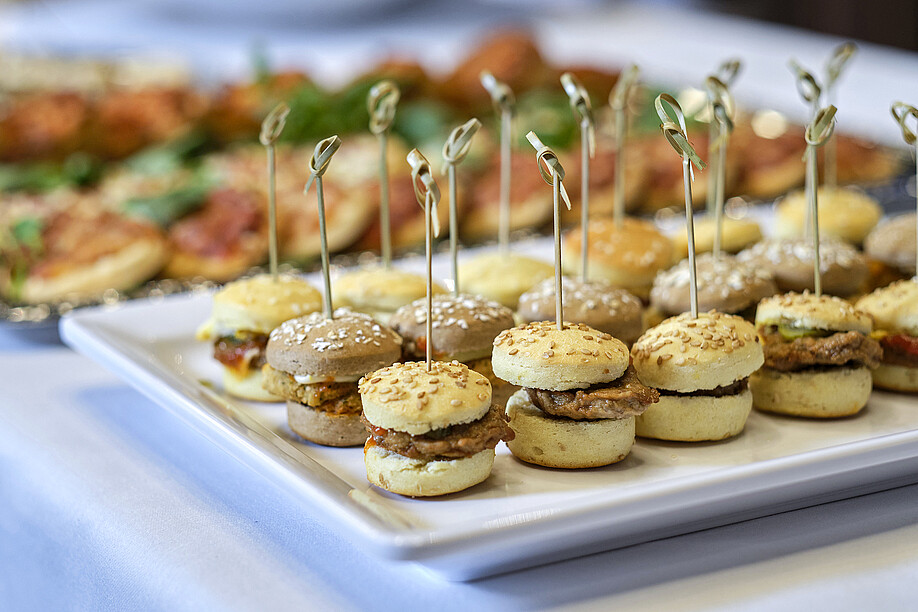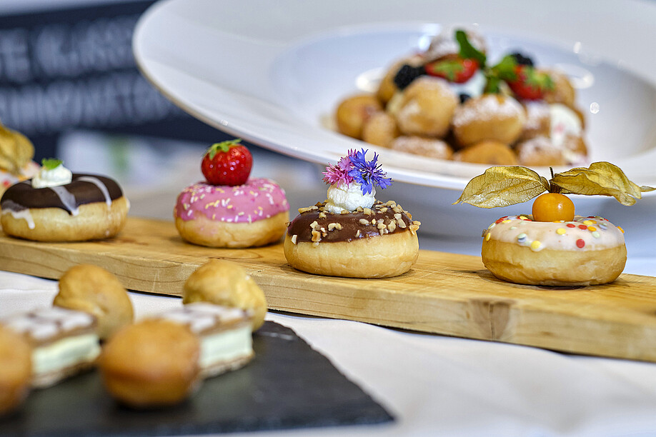Pizza Margherita, Flammkuchen, Tomaten Bruschetta, drei verschiedene Burger und drei Varianten Bagels. Daneben finden sich Profiteroles, Donuts, Berliner, Crèmeschnitten, Churros und als kalter Abschluss Mochis. Es ist ein beeindruckendes Buffet, das an diesem Nachmittag präsentiert wird. Und ein überraschendes: denn alle Leckereien sind im Mini-Format gehalten. Das sieht witzig aus und füllt erst noch den Bauch weniger schnell, so dass man sich ohne schlechtes Gewissen einmal durch das ganze Buffet probieren kann.