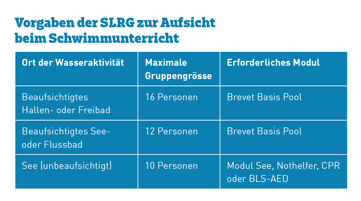 Die Verantwortung der Lehrpersonen sei bereits im Hallenbad hoch. Dagmar Rösler verweist dabei auf den Leitfaden des LCH zur rechtlichen Verantwortlichkeit. Ein Kapitel widmet sich dem Schwimmunterricht und enthält verbindliche SLRG-Richtlinien zu Gruppengrössen und Qualifikationen der Aufsichtspersonen (siehe Tabelle). «In der Praxis zeigt sich da rasch eine Herausforderung: Viele Schulklassen bestehen aus mehr als 20 Kindern. Das erschwert die Umsetzung bereits im Hallenbad ohne zusätzliche, qualifizierte Begleitpersonen.»