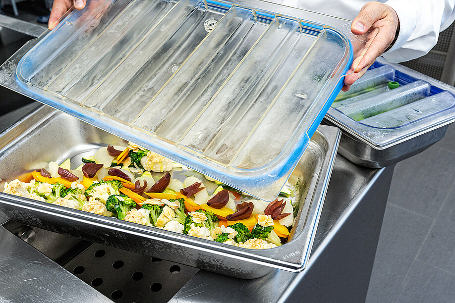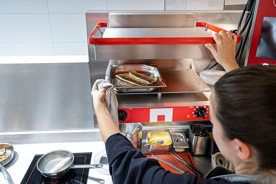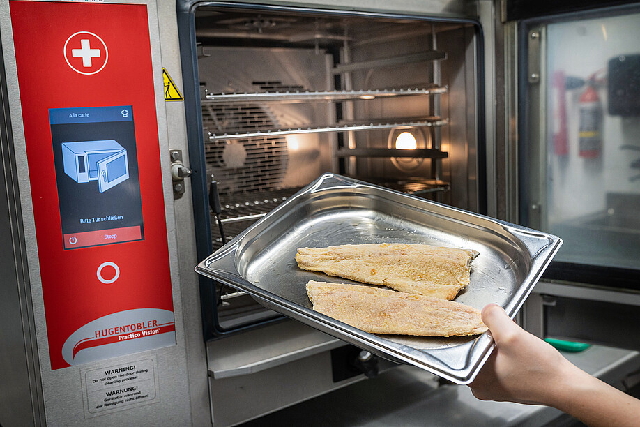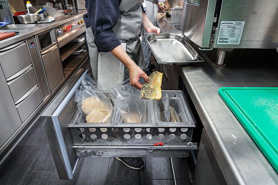 In den Kombisteamern Practico Vision Plus von Hugentobler werden beispielsweise die Gemüsegarnituren regeneriert, die während der ehemaligen Zimmerstunde vorproduziert, schnellgekühlt und in GreenVac-Behältern luftdicht verpackt wurden. Immer, wenn Forellen aus dem lokalen Gonzenbach verfügbar sind, heisst es in der Kronen-Küche ausserdem: Filetieren, im Kipper sautieren, schockfrosten! So können jederzeit regionale Fischfilets einfach im Kombisteamer regeneriert und unter dem Salamander kross gebraten werden. Die Kalbfleischröllchen oder die Pouletbrust wiederum werden im Sous-Vide-Bad regeneriert, direkt im Vakuumbeutel, in dem sie in einem ruhigen Moment – vor bis zu 21 Tagen – bereits einmal sous-vide gegart und dann schnellgekühlt wurden.