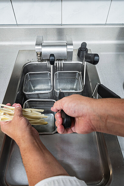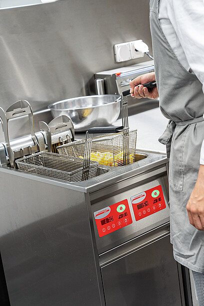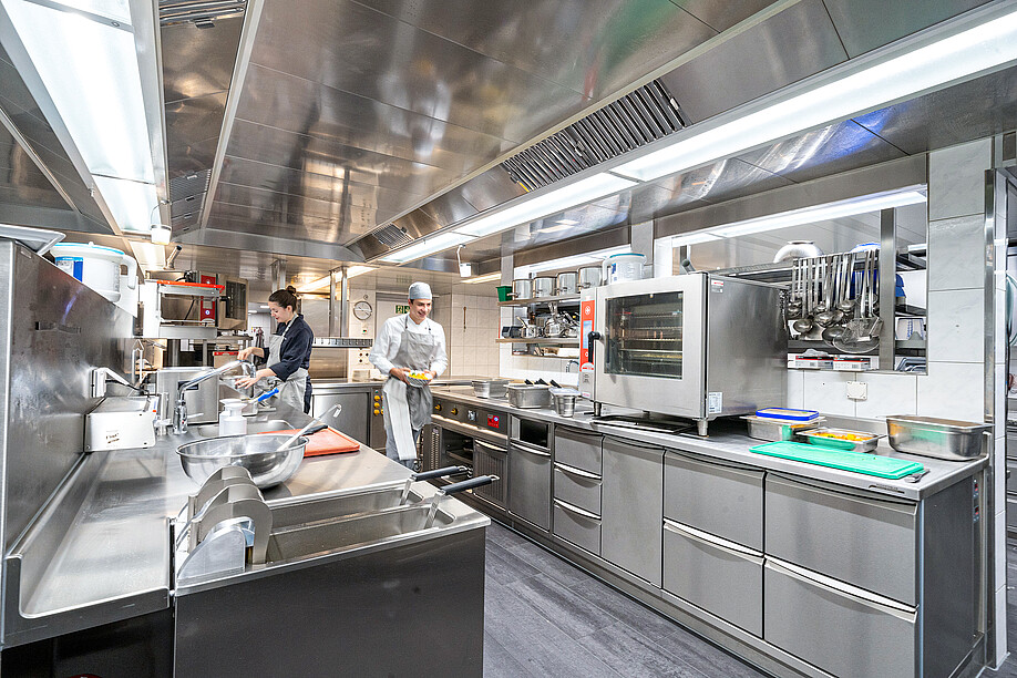 Heute sind sowohl die Kronen-Küche als auch der Kühl- und Tiefkühlbereich doppelt so gross. Von diesem gelangt man vorbei an der neuen Abwaschstrasse, grosszügigen Rüstplätzen sowie einem separaten Bankett-Bereich nach vorne zum Schweizer Herd von Hugentobler. Anstatt einem Zentralherd besteht dieser aus zwei langgezogenen Arbeitsbereichen mit nur wenigen Induktionskochfeldern. Dafür stehen — geschickt in die Küche integriert — nun Fritteuse, Induktionsgrill, Pastakocher, Salamander, zahlreiche TK-Schubladen, Kipper, mehreren Hold-o-maten, Schockfroster, CSC-Sous-Vide-Bad-Geräte und Kombisteamer Practico Vision Plus in den unterschiedlichsten Grössen im täglich fordernden Einsatz.