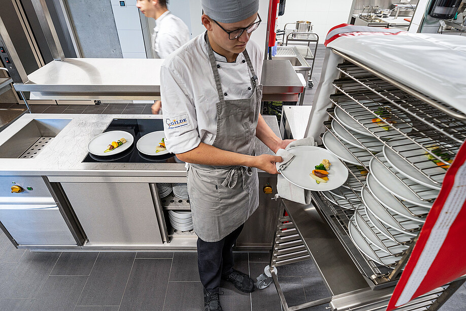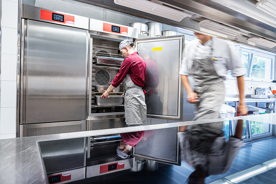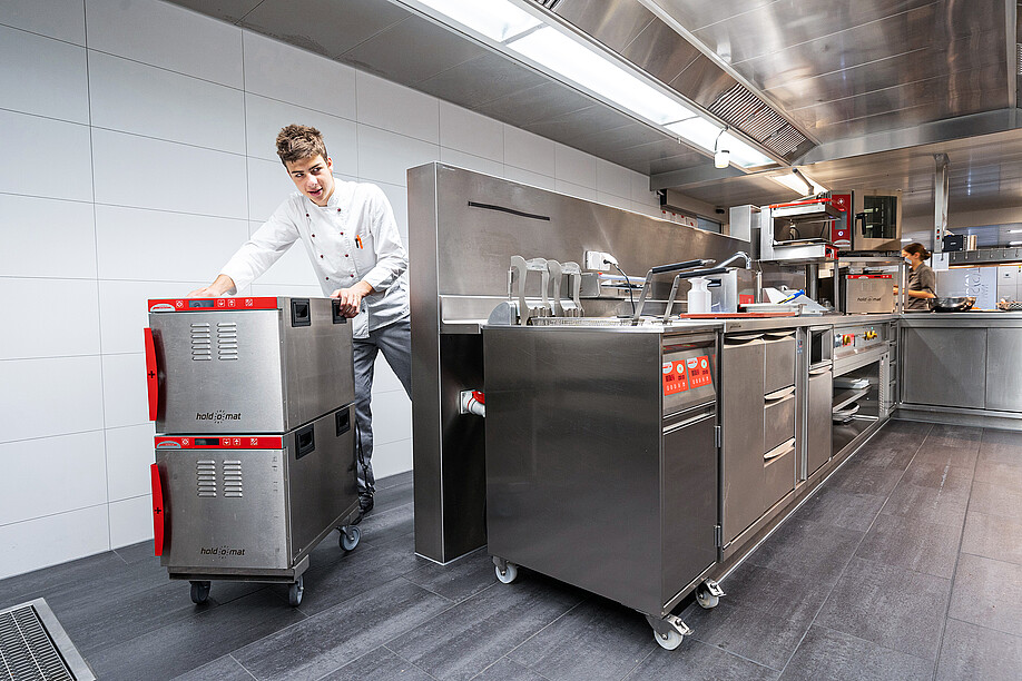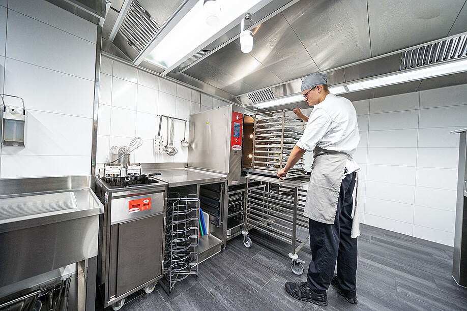 Auch Philipp Schneider zieht ein durchwegs positives Fazit. «Früher musste es oft vor allem schnell gehen. Jetzt können wir uns wieder Zeit nehmen, das steigert die Freude am Kochen.» Vorproduziert wird nach Produktionsplan – quasi Gerichtskomponente um Gerichtskomponente, um die man sich rund alle zwei Wochen kümmert. «Für mich als Gastronom bedeutet dies auch bessere Planbarkeit, grössere Einkaufs- und Produktionsmengen, weniger Food Waste und nicht zuletzt zufriedene Mitarbeitende.» Auch das ist ein wichtiger Aspekt, unterstreicht Reto Emmenegger von der Hugentobler Schweizer Kochsysteme AG. «Ich werde oft darauf angesprochen, wie schwierig es ist, gute Arbeitskräfte zu finden. Philipp Schneider zeigt hier einen Weg auf, wie man die Arbeitsplätze für Köche wieder attraktiver machen kann.» Das werde ihm auch von seinem Team laufend bestätigt, betont Philipp Schneider, der sich offen zeigt, interessierte Berufskollegen in seiner Küche herumzuführen. «Das 4/3-Modell, das nur dank der neuen Abläufe möglich ist, kommt super an. Und könnte künftig ein entscheidendes Argument auf dem Arbeitsmarkt sein, wenn nicht sogar für den Berufsstand», betont der leidenschaftliche Ausbildner.