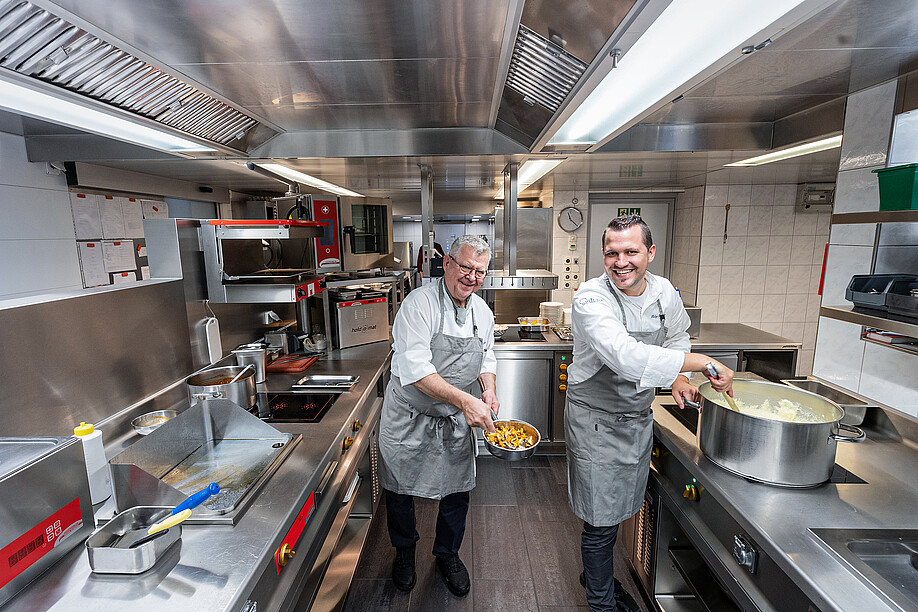 Als Bruno Schneider zum ersten Mal von diesem Vorhaben erfuhr, war er nicht begeistert. «Ich koche seit fast 40 Jahren traditionell, und es hat immer funktioniert», habe er gesagt, erinnert sich der Senior-Gastgeber. Das war 2019, als man im Rahmen der Umbauplanung auch die Küchen-Renovation anging. Von früher her kannte die Familie Schneider mit Reto Emmenegger und Günther Rüscher gleich zwei Vertreter aus dem Umfeld der Hugentobler Schweizer Kochsysteme AG und fragte nach einer Küchenofferte. Schnell kam seitens von Hugentobler der Wunsch, vor dem Hintergrund des täglichen Stresses und des erweiterten Angebotes die Arbeits- und Kochabläufe zu hinterfragen. Nach einem Kurs in Schönbühl — am Hauptsitz des Profis für Grossküchenapparate, für Kochsysteme sowie für Projektierung und Montage von Grossküchen — waren sowohl Bruno Schneider als auch Philipp Schneider vom Konzept angetan. «Aber so gut das klingt, man muss es auch auf seinen Betrieb ummünzen können», betont Philipp Schneider gegenüber GOURMET. Wann sollte Zeit bleiben zum Vorproduzieren? «Einzig während der Zimmerstunde, und so entstand die 4/3-Idee.»