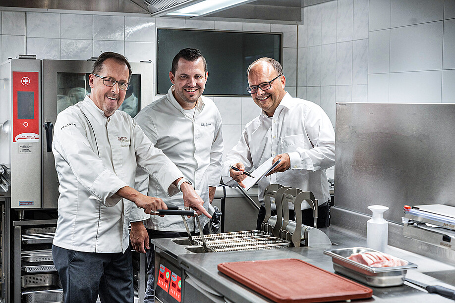 Sie hätten sich schon zuerst an die neuen Geräte und Abläufe gewöhnen müssen, sagt Philipp Schneider. Ein Prozess, der bereits in der alten Küche begann, eng begleitet von Günther Rüscher in seiner Rolle als Küchencoach der Hugentobler-Tochtergesellschaft GastroPerspektiv AG. «Das beginnt meist mit Probestellungen, bei denen wir zum Beispiel einmal einen Schockfroster in der Küche platzieren. Zusätzlich mache ich jeweils eine Betriebsanalyse, beobachte die Abläufe, sammle Zahlen, zeige auf, was alles möglich ist. Und so entsteht Schritt für Schritt ein passendes Koch- und Küchenkonzept.» Die Küchenplanung, abgestimmt auf ebendieses Konzept, erfolgt dann wieder direkt bei Hugentobler. «Mit unserer langjährigen Erfahrung achten wir darauf, dass die Küche nicht nur auf dem Papier, sondern später auch im Betrieb funktioniert, jedes Gerät exakt seinen richtigen Platz hat, damit die Abläufe stimmen», sagt Reto Emmenegger, Regionalverkaufsleiter Ost der Hugentobler Schweizer Kochsysteme AG.