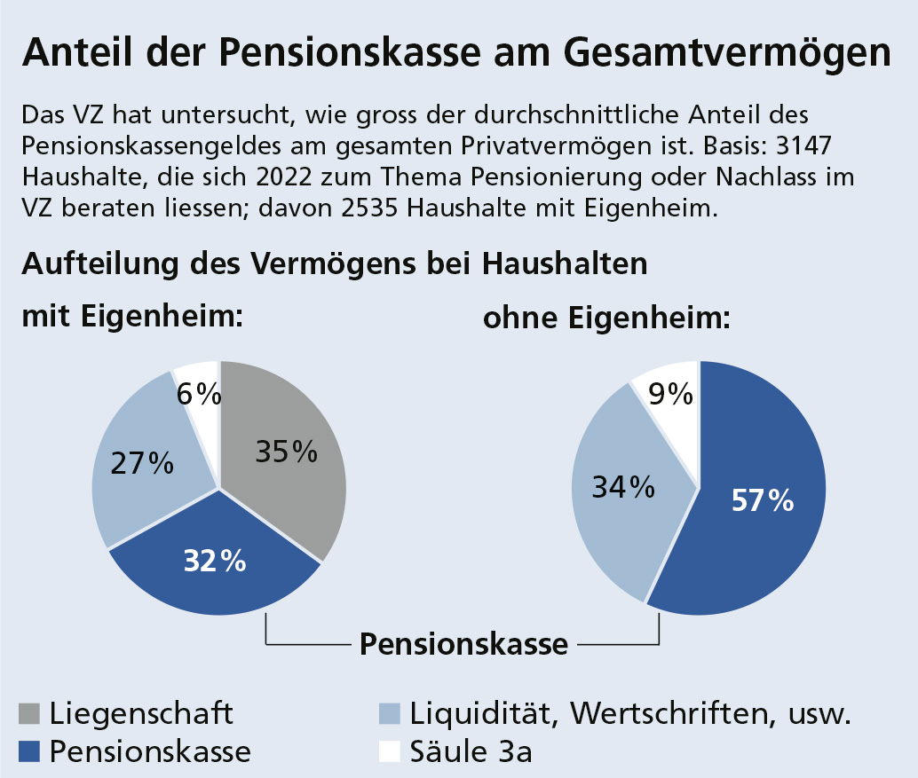 - Im Schnitt stecken 57 Prozent des Vermögens in der Pensionskasse. Zählt man die Säule 3a dazu, sind es zwei Drittel (Grafik).