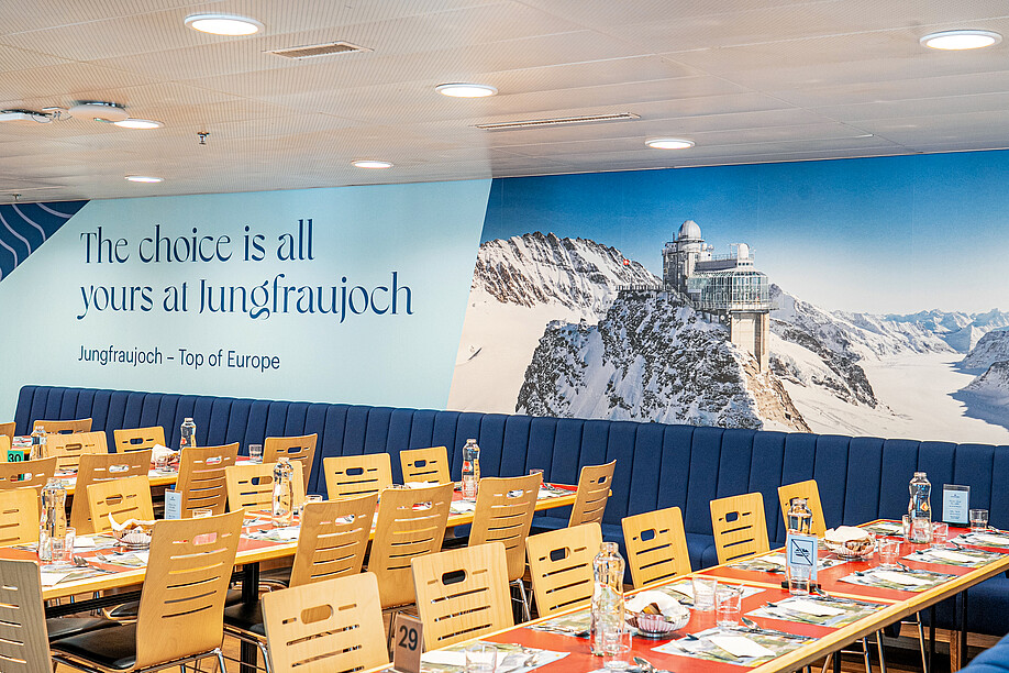 Oben angekommen, erwartet einen nicht nur eine fantastische Aussicht und ein erlebnisreicher Rundgang von der Sphinx-Terrasse, durch den Eispalast bis auf das Gletscherplateau, auch kulinarisch hat die Bergstation vieles zu bieten. Schliesslich wollen die rund eine Million Gäste, welche das Jungfraujoch jährlich besuchen, versorgt werden. Dass dies so reibungslos wie möglich gelingt, ist unter anderem die Aufgabe von Martin Uetz. Er ist seit zwei Jahren Leiter der Jungfrau Gastronomie AG. Nebst den fünf Betrieben auf dem Jungfraujoch ist er auch für die Gastronomie auf dem Eigergletscher, der Kleinen Scheidegg und für jene im Grindelwald Terminal zuständig. Insgesamt verantwortet er ein Team mit einem Gesamtpensum von 117 Vollzeitstellen, das Gäste aus aller Welt betreut. «Gastfreundschaft ist für uns zentral. Wir geben täglich unser Bestes, um allen einen unvergesslichen Aufenthalt zu ermöglichen», erzählt er uns auf der Sphinx-Terrasse und lässt den Blick über das Geländer in Richtung Grindelwald schweifen. In diesem Bergdorf ist Martin Uetz aufgewachsen und nach einigen Jahren in der Ostschweiz wieder zurückgekehrt.