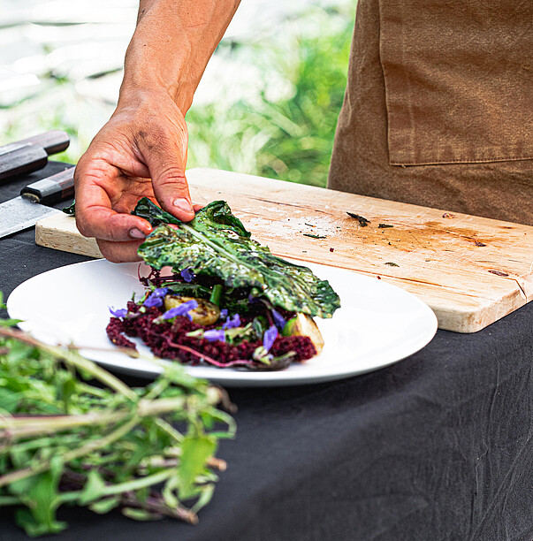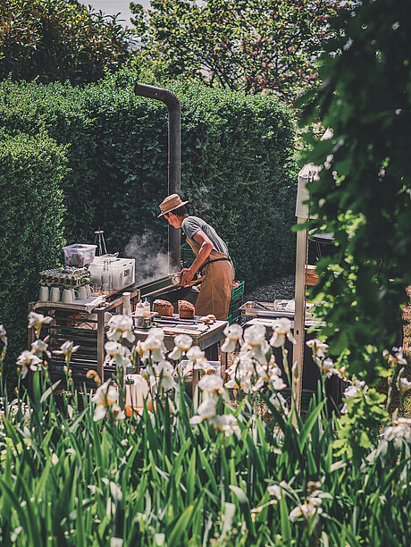 Vom «Samen auf den Teller» heisst sein kulinarisches Programm heute. Die reichhaltige Ernte und die eigenen Produkte verkauft er auf benachbarten Märkten, direkt ab Hof und im Onlineshop, er vertreibt Warenkörbe im Abo und beliefert ein paar Restaurants in der Region mit frischem Gemüse. Er bietet Kurse zu Themen wie Fermentation und pflanzliche Küche an, organisiert Sonntags-Brunches und zwischendurch «Tables d‘hôtes» in seinem Garten und neu im benachbarten Château, um ganzjährige Angebote zu schaffen. Ein «Table d‘hôte» ist so etwas wie ein Stammtisch, an dem maximal 20 Personen zusammensitzen. Raphaël Gétaz und sein Team servieren, was der Garten hergibt, alles vegetarisch. Das Finishing erfolgt vor Ort auf dem Holzkohlegrill und dem alten Ofen seiner Grossmutter mit extralangem Ofenrohr. Und wie bei Alain Passard ist es die Natur, die das Menu diktiert. Delikatessen vom Feld.