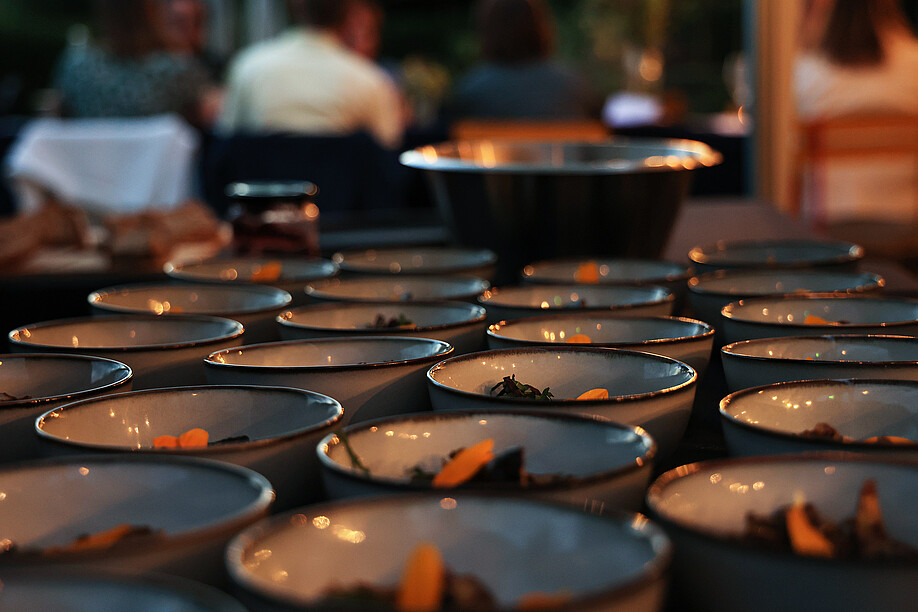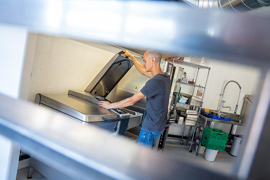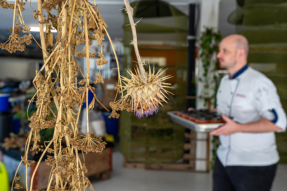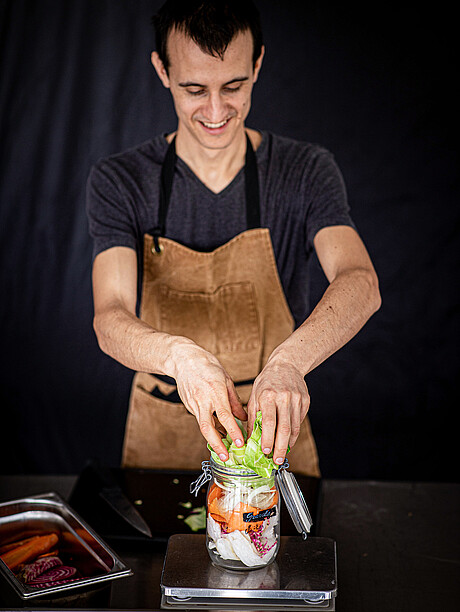 Diese Erlebnisvielfalt hat der vielseitige Koch seit letztem Jahr im Angebot. Die Mise-en-Place für Brunch und Stammtisch sowie die Produktion von Caterings und Verkaufsprodukten erfolgen in der Produktionsküche im benachbarten Allaman. Hier stehen ein iCombi Pro 10-1/1 und ein iVario Pro 2-S von Rational im Einsatz, daneben nur noch kleinere Gerätschaften wie Handrührgeräte, zudem viele Schüsseln, stapelweise GN-Schalen und palletweise Weckgläser. Hier werden auch Kräuter und Blumen getrocknet, Zutaten gelagert und die frisch hergestellten Produkte, die noch nicht im Lager sind – Tomatensugos, Pestos, eigene Misos und Sojasaucen. «Der iVario Pro ersetzt für mich viele der herkömmlichen Kochgeräte.» Das Gerät erlaubt zu kochen, frittieren und braten. Mit iZone Control hat man die Möglichkeit, den Tiegelboden in bis zu vier Zonen einzuteilen und diverse Gemüse gleichzeitig bei unterschiedlichen Temperaturen zuzubereiten, ohne dass man einen Herd und mehrere Pfannen benötigt.