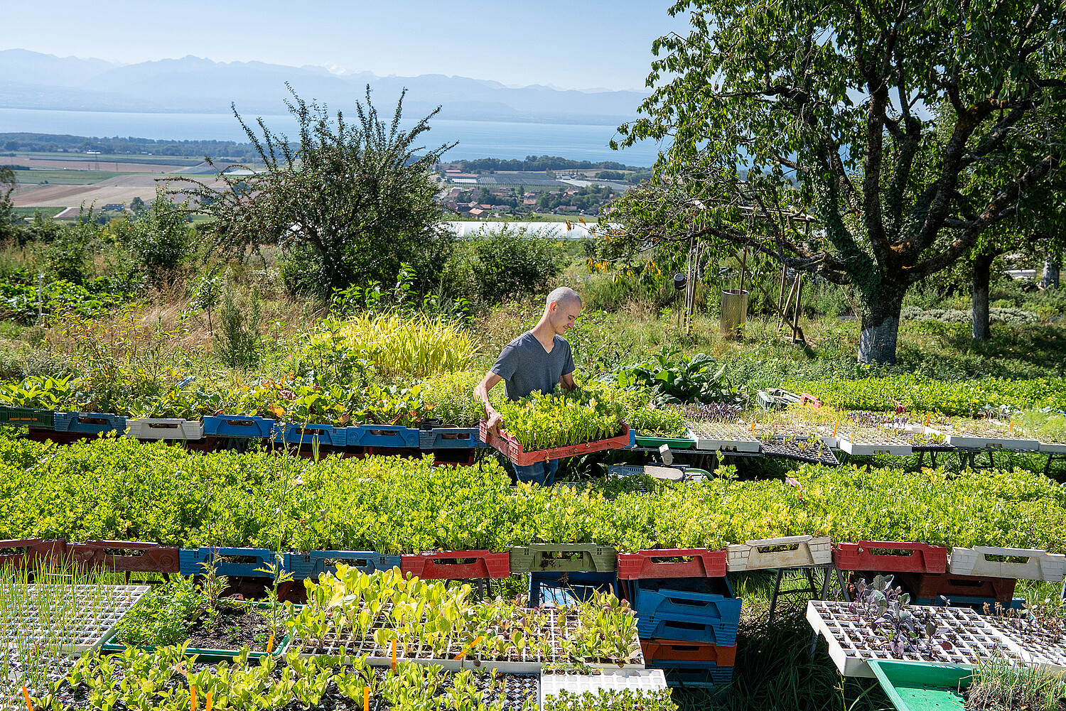 In den «Les Jardins de Chivrageon» auf 580 Metern beugen sich die Tomatenstauden unter der Schwere ihrer Früchte, die Zucchetti künden mit gelben Blüten ihr Gedeihen an und in Saatschalen wachsen Setzlinge für das Wintergemüse heran, Feder- und Rosenkohl, Endivien und Zuckerhut. Kräuter duften, Johannis- und Himbeersträucher säumen die Beete. Enten schnattern. Eine Idylle am Hang, wild und unglaublich schön. Der Blick reicht bis zum Jet d’Eau in Genf und zu den Alpen im Hintergrund.