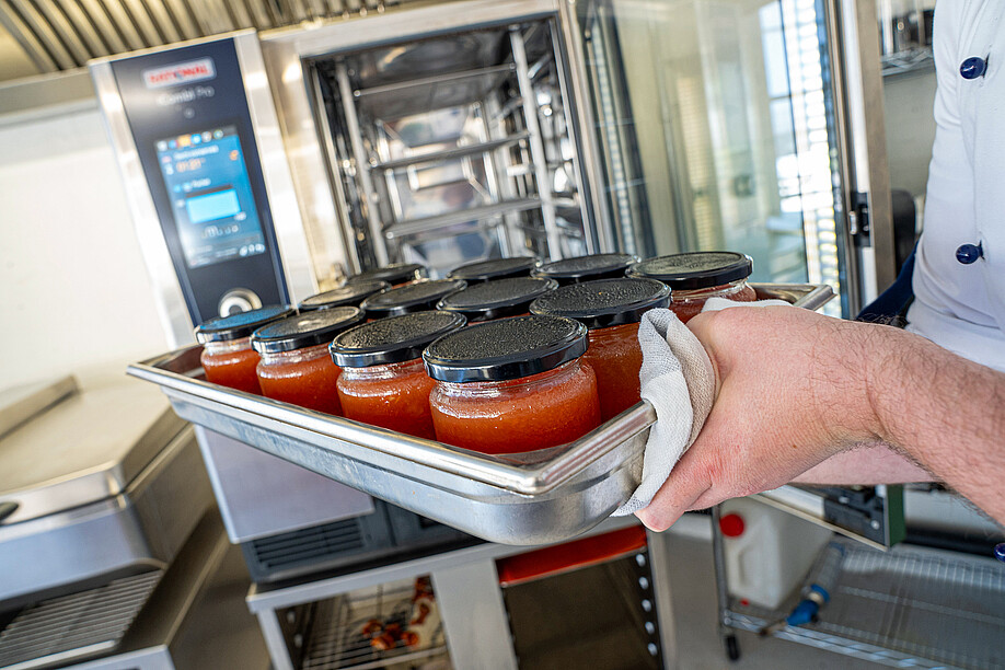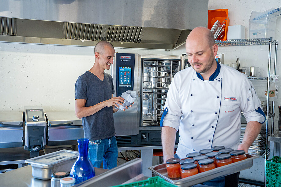«Wir haben immer und überall viel Arbeit. Der Grossteil der Küchenarbeit liegt auf meinen Schultern, und die Rational-Kochsysteme helfen mir, Prozesse schlank zu halten. Gleichzeitig sind sie enorm effizient: Ich kann allein mit diesen zwei Geräten Caterings für bis zu 200 Personen produzieren und zubereiten. Das alles funktioniert, weil die Geräte mitdenken, dazulernen, unterstützen, so dass ich nicht die ganze Zeit daneben stehen muss, sondern die Kochprozesse beispielsweise auch vom Feld aus überwachen, Rezepte und andere Programmierungen vom PC aus erledigen kann», betont Raphaël Gétaz gegenüber GOURMET, der Rational-Geräte gut kennt und immer schon sagte: «Wenn ich einmal eine eigene Küche betreibe, möchte ich mit Rational arbeiten.» Mit Ehrhard Busch hat er jetzt einen Partner im Boot, der sich als Vegetarier besonders gut mit seinem Geschäftsmodell identifizieren kann: «Nach der Inbetriebnahme war ich für die Einführung der Geräte verantwortlich. Gemeinsam arbeiten wir an der Programmierung der Prozesse, um mit intelligenten Garpfaden soviel wie möglich zu automatisieren.» Daraus entstand ein reger Kontakt. Ehrhard Busch war natürlich auch mit Raphaël Gétaz im Feld und findet es cool, Rational-Geräte einmal in einem ganz anderen Umfeld zu sehen als in der klassischen Gastronomie. «Das zeigt, welche Mehrwerte die Rational-Geräte auch hier erbringen. Die Effizienz der Geräte bietet Start-ups in der Konsolidierungsphase ebenso Hand wie etablierten Betrieben, die mit dem derzeit vorherrschenden Personalmangel konfrontiert sind», sagt Ehrhard Busch. Diese Effizienz in qualitativ hochstehende Bio- und Demeter-Produkte umsetzen, das ist Raphaël Gétaz Stärke, der im iVario Pro und im iCombi Pro beispielsweise ein Citron Confit herstellt, kandierte Zitronen, deren Verbindung von Säure und Salz eine aromatische Sensation hervorbringt. Oder frisch geernteter Lauch, der — vorsichtig gegrillt und mit etwas Essig angereichert — zur Konservierung einen einzigartigen Geschmack erlangt. Er produziert Hummus aus Sojabohnen, Zucchinipesto mit fünf Basilikum-Arten oder ein Tomaten-Concassé mit Zitronenbasilikum. Sein Geheimnis: Er erntet Tomaten und anderes Gemüse bis zu dreimal pro Woche, dann also, wenn es den Höhepunkt der Reife und damit den intensivsten Geschmack erreicht hat. Denn nur so vermag das Concassé später an nebligen Herbst- und Wintertagen an die vergangenen, heissen und unbeschwerten Sommertage zu erinnern!