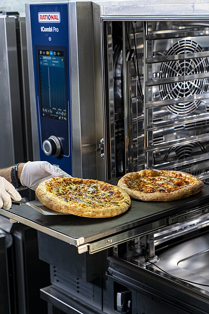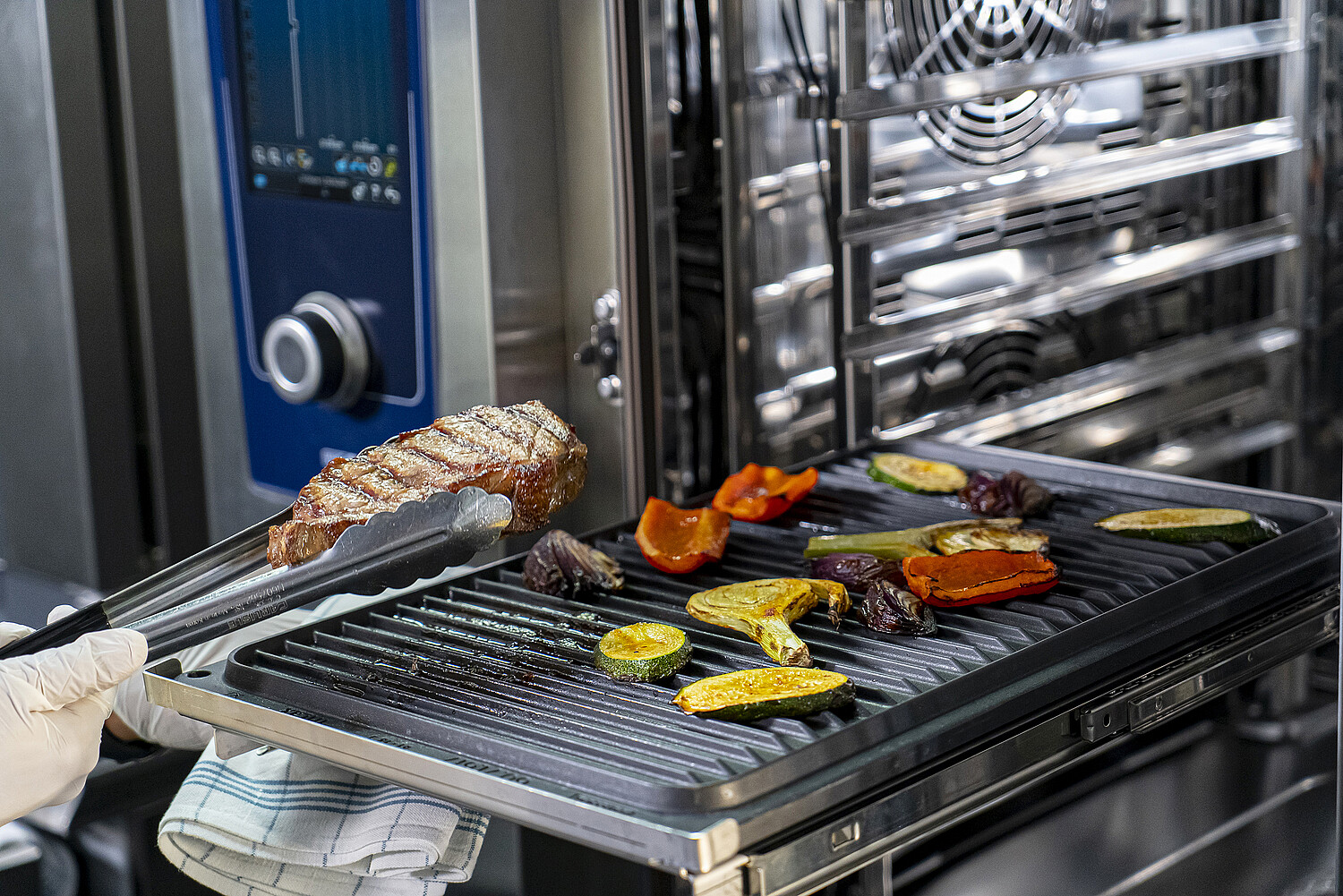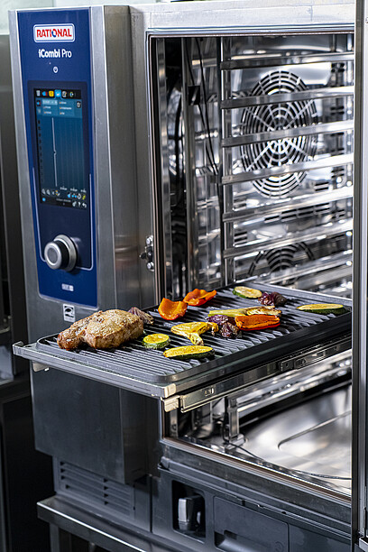 Gerade im A la carte Bereich oder bei der Zubereitung von Lebens-mitteln an der heissen Theke ist der Platz oft begrenzt. Wohin also mit dem heissen Blech? Ab sofort bleibt es im Rational Combi-Dämpfer, wird über die Auszugsschiene nur bei Bedarf herausgezogen und nach dem Entladen wieder zurückgeschoben. Deutlich sicherer und komfortabler, als das heisse Blech immer wieder ganz herauszuholen.