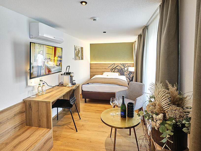 Das Dorf und seine Umgebung scharen mehrere namhafte Industriebetriebe um sich, die einem Hotel-Restaurant ebenso zuträglich sind wie der Tourismus. Und auch die Messestadt Basel spült Gäste nach Niederbipp, das sei deutlich spürbar, sagt Geschäftsführer Lucas Weder, der das Restaurant im Juni 2021 und die Hotelzimmer Anfang dieses Jahr in Betrieb genommen hat. Elf Zimmer, vom Einzel- über das Queensize- bis hin zum Doppelzimmer Superior, die Hans Brönnimann, Mitinhaber und Innenarchitekt der Gschwend AG Gastro-Bau, mit viel Liebe zum