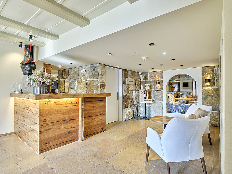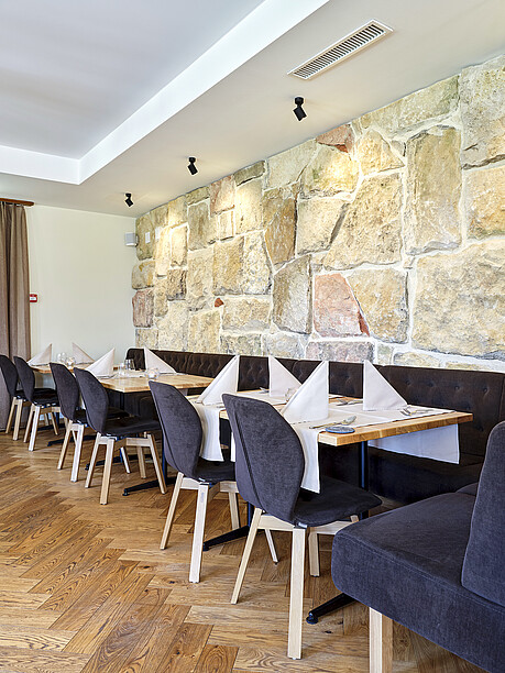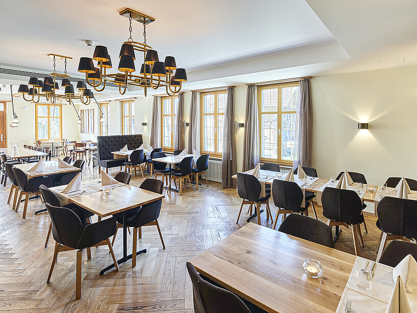 Optisch zieht Hans Brönnimann den roten Faden von den Hotelzimmern über die Reception — die mit der Bar verbunden ist und damit Effizienz in die Abläufe bringt — zu Gaststube, Stübli und Gartenterrasse. Nebst viel Eiche kommt auch dem Jura-Stein eine vermittelnde Rolle zu. Er findet sich in geschliffener Form im Plattenboden des Restaurants, als Sichtmauer im Stübli und in Form grosser Natursteine in der Schutzmauer, welche die Gartenterrasse von der Strasse abgrenzt. «Wir legten Wert auf echte Materialien, zeigten Substanz, indem wir Ursprüngliches hervorholten und inszenierten, was hinter Verkleidungen versteckt war, so wie die alte Holzbalkendecke im Gastraum oder die Sitzbänke aus Eiche, die den Gastraum umarmen und teilweise bereits ausgemustert im Keller lagerten. Das Resultat ist ehrlich, massiv und vieles Bestandteil der ursprünglichen Substanz des Hauses», betont Hans Brönnimann gegenüber GOURMET. Kontraste in Farbe und Stil schaffen die Polsterstühle und Sitzbänke mit schwarzem Veloursbezug, die Kronleuchter mit schwarz plissierten Lampenschirmen an goldenen Stahlgerüsten und die individuell ausrichtbaren Leuchten mit schwarzen Arm- und Kugelgelenken, um die Lichteffekte nach Bedarf auszurichten. Modische Highlights, mit Bedacht eingesetzt.