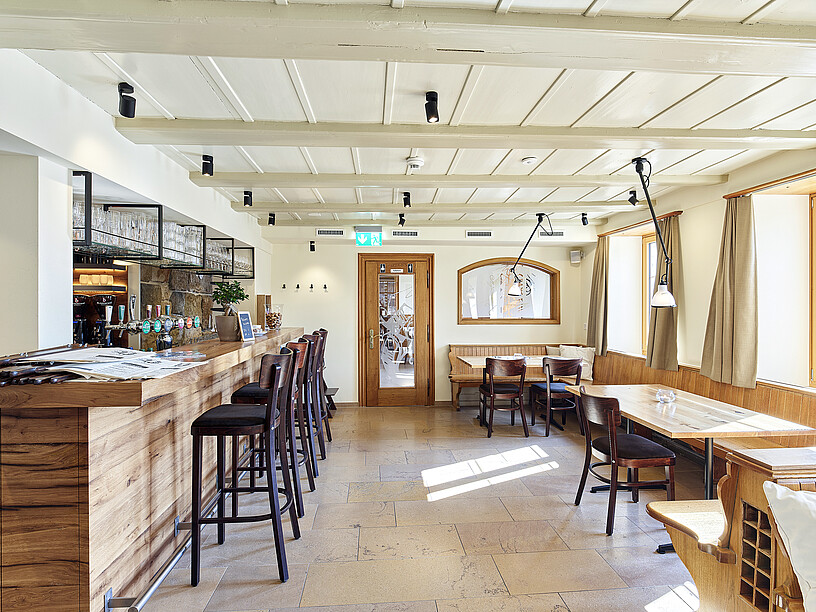«Noch vor den Hotelzimmern haben wir aus strategischen Gründen das Restaurant saniert, um den Betrieb so rasch als möglich aufzunehmen», erklärt Pächter Lucas Weder, der seine Bedürfnisse als Betriebsführer von Anfang an einbringen konnte und sein Augenmerk auf rationelle Abläufe für eine effiziente Produktion richtete. Entstanden sind eine Gaststube und ein Stübli mit 80 Sitzplätzen sowie eine neu gestaltete Gartenterrasse mit 130 Sitzplätzen. Der bestehende Saal im Ökonomieteil bietet weitere 80 Plätze. Der Bären sollte bleiben, was er war, ein Treffpunk für die Menschen im Dorf und in der Umgebung, für Vereine, Familien und Firmen, die hier ihre Versammlungen durchführen, Jubiläen und Geburtstage feiern, all jene Feste auch, die wie Marksteine die Lebensläufe der Menschen auszeichnen — von der Taufe über die Konfirmation und Hochzeit bis hin zur Abschiedsfeier.