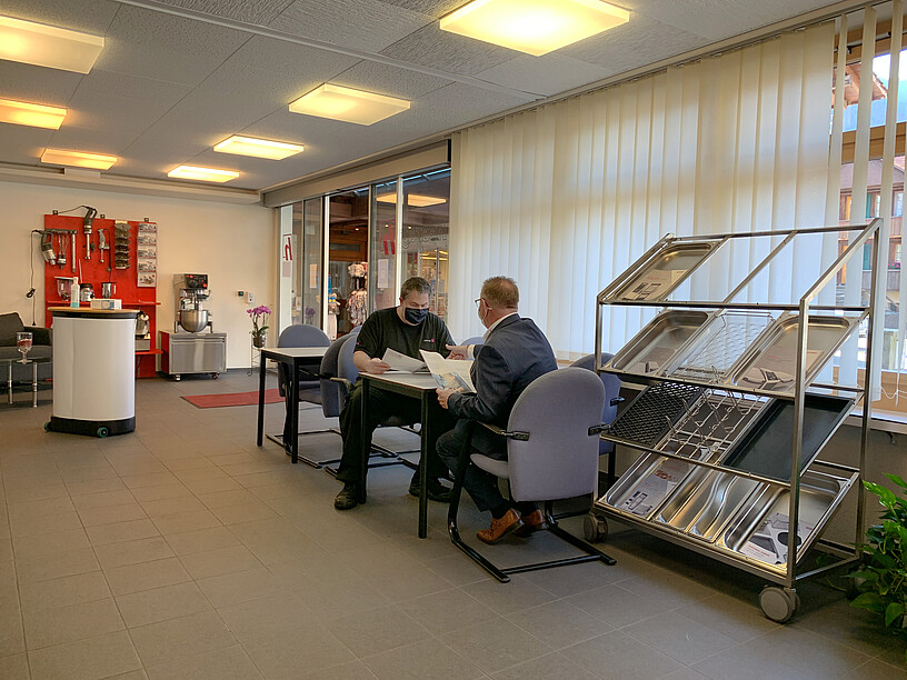 Unternehmer Marc Stämpfli strebt dauerhafte Beziehungen zu seinen Kundinnen und Kunden an und erreicht das unter anderem durch ein gezieltes Miteinander von Verkauf und Service: «Bei einer allfälligen Störung wird der Techniker avisiert. Sobald er vor Ort den Fehler lokalisiert hat, holt er das Ersatzteil aus dem Auto und schliesst seinen Besuch ab. Das gelingt in 95 Prozent der Fälle. Ist das fehlende Teil nicht an Bord, ist der Weg zum Standort kurz, der Servicetechniker effizient und schnell.» Diese hohe Erstreparaturquote ist beachtenswert und schafft Vertrauen, wenn sich ein Gerät einmal nicht mehr reparieren lässt und eine Neuanschaffung oder Erweiterung nötig ist. Dann reicht der Servicefachmann den Ball dem Verkaufsleiter weiter, der den Blick fürs Ganze mitbringt, weg vom Einzelgerät hin zur Beurteilung des Gesamtbetriebs.