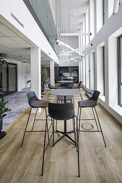 Das Ergebnis ist ein modernes Restaurant, das die räumlichen Gegebenheiten perfekt aufgreift. Zum Beispiel die Säulen, die im Bistro mit Stehtischen verbunden sind und im Restaurant die Eckpfeiler einer Insel bilden, die Rückzugsort und Raumteiler zugleich sind. Runde Akustikplatten aus recyceltem PET sorgen trotz offener Decke für eine angenehme Akustik und harmonieren wunderbar mit den grosszügigen kreisförmigen Leuchten. Alles in allem ist ein stimmiges Gesamtbild entstanden und zwar aus einer grandiosen Teamarbeit - von Profiplan AG, heer AG und beck konzept ag.