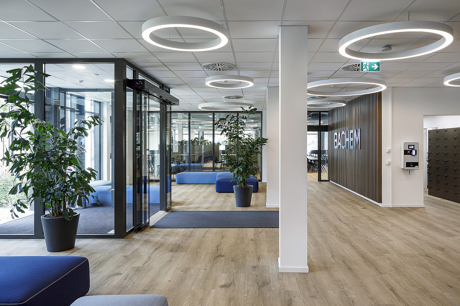 Die Bachem Group kombiniert die Hauptfarbe Blau mit knalligem Magenta, Orange, Gelb, Cyan und Grün. Ein erster Entwurf griff dieses Farbenspiel auf, das aber bald zugunsten von dezenten Erdtönen verworfen wurde. Lediglich im Eingangsbereich findet sich das Blau mit den Loungesesseln und dem Bachem-Schriftzug wieder. Und auch im Aussenbereich setzen Gartenstühle in den verschiedenen Bachem-Farben die gewünschten Akzente. «Dieser Zwischenschritt war wichtig, weil es einerseits unsere Aufgabe ist, die Wünsche des Kunden aufzunehmen, andererseits, weil man anhand vorhandener Skizzen besser entscheiden kann», erklärt Roland Walker, und auch Diana Rinderle schmunzelt: «Für uns war schnell klar, dass wir farblich einen anderen Weg gehen müssen.»