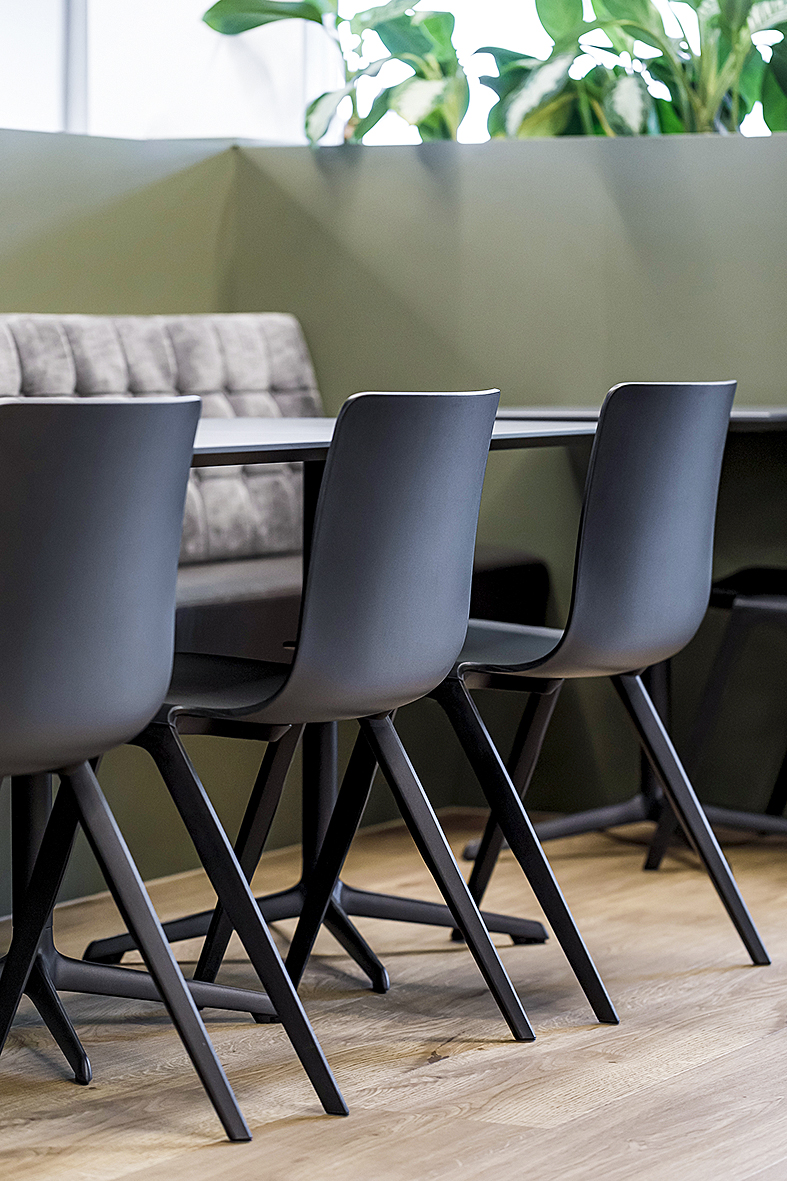 Letzteres erforderte eine genaue Abstimmung mit der beck konzept ag, die sämtliche Verkleidungen produzierte - Resopalplatten in Beige mit kontrastierenden Holzverkleidungen in Dunkelbraun an den Vertikalen. Das Farbkonzept und die gesamte Innenarchitektur entstammen der kreativen Feder von Noah Kaufmann, Innenarchitekt der beck konzept ag. «Die Anforderungen waren pflegeleichte Materialien und eine modulare Einrichtung mit stapelbaren Stühlen und klappbaren Tischen sowie eine farbliche Anlehnung an das Corporate Design von Bachem, was eine Herausforderung war», schmunzelt Noah Kaufmann.