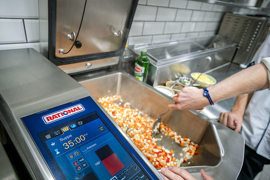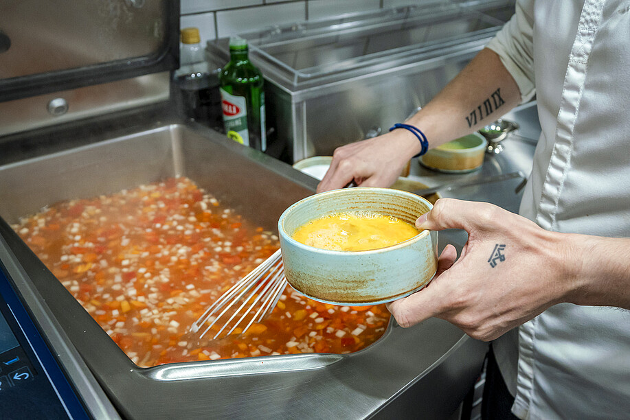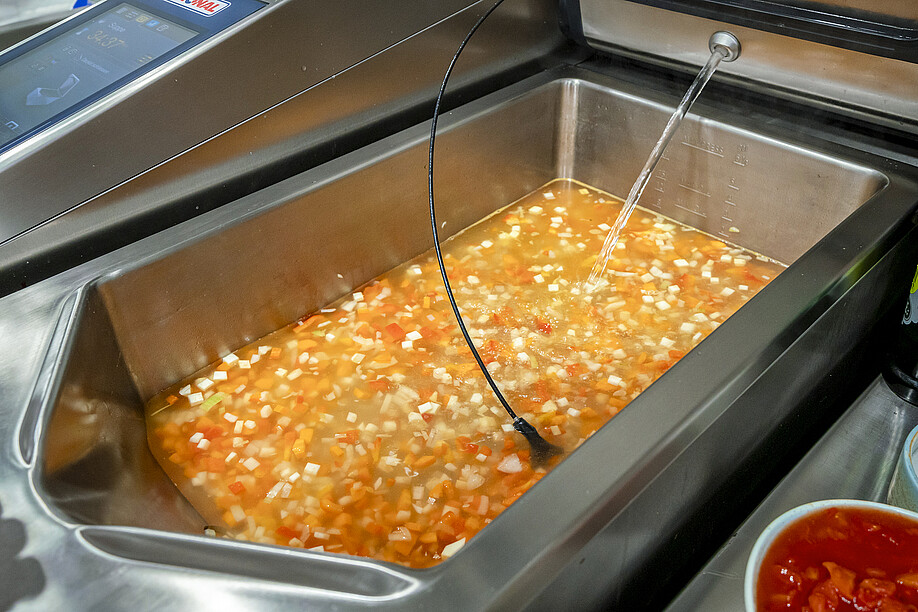 Fabian Dumitrache: Ich starte gerade mit der Produktion von 25 Liter Ciorba, eine Gemüsesuppe nach dem Rezept meiner rumänischen Oma. Dafür dämpfe ich jetzt zuerst das Gemüse an. Das geht viel schneller im iVario Pro als früher im Topf. Und konstanter.