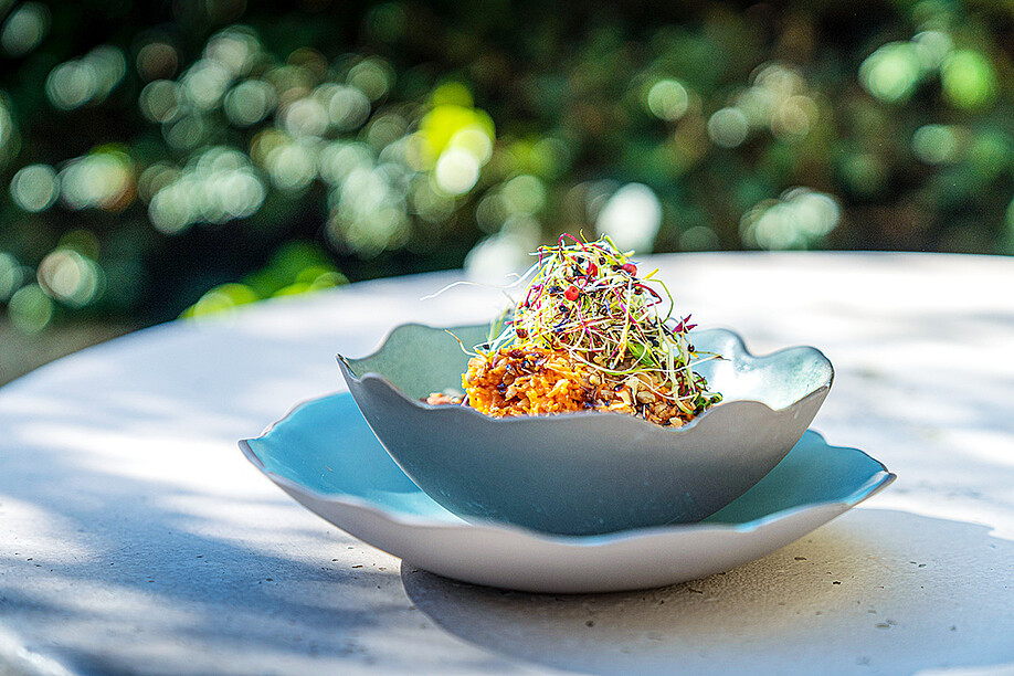 Auf der Speisekarte der «Auberge des trois Coqs» finden sich auch Barsche aus den Walliser Bergseen und Forellen aus den Bächen im Jura, Prättigauer Biokäse, Lachs aus den Bündner Bergen, Simmentaler Bio-Eistee und Honig vom Nachbarn. Oder die proteinreichen Linsen mit dem Slowfood-Label aus Saint-Flour in Frankreich und der nordindische Bio-Basmatireis vom Fusse des Himalayas. Den Bestseller der «Auberge des trois Coqs» gilt es hier besonders zu erwähnen: Der Rüeblisalat aus Biokarotten vom Seeland. «Oft komme ich mit dem Bestellen der begehrten Bio-Rüebli gar nicht nach, ich bin gefühlt stundenlang am Raspeln», lacht der sympathische Gastgeber. In seiner Küche wirkt er übrigens allein, Ehefrau Anick ist für den Empfang und für den Service verantwortlich. Ein grosses Unternehmen für nur zwei Personen, die sich ganz dem «Hausgemachten» verschrieben haben. Aus diesem Grund ist das Restaurant samstags und sonntags geschlossen. «So haben wir doch noch etwas wichtige Familienzeit.»