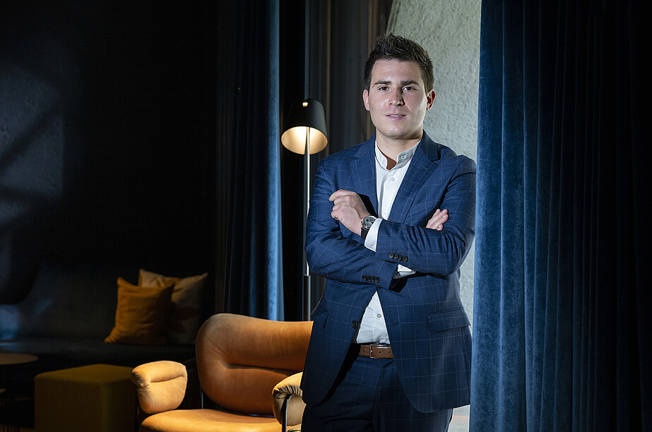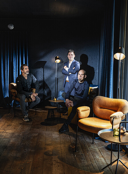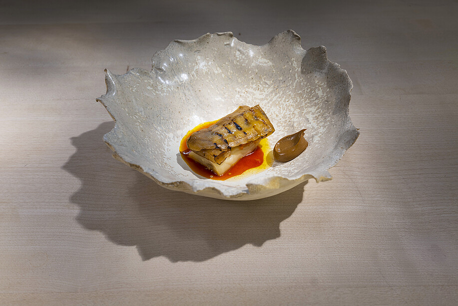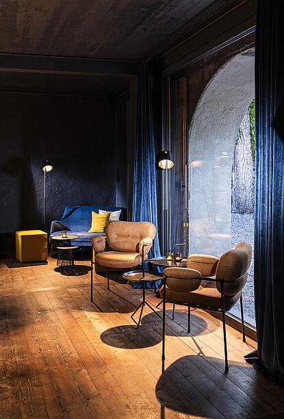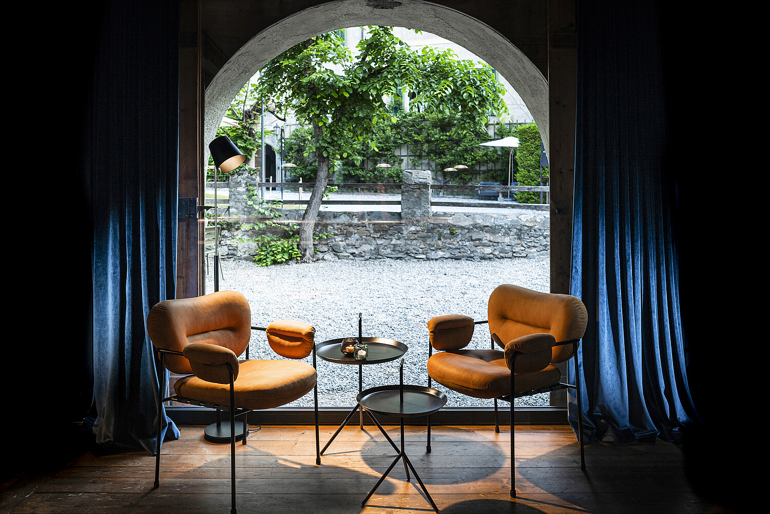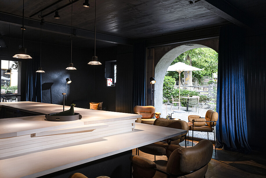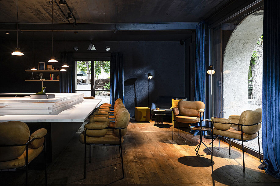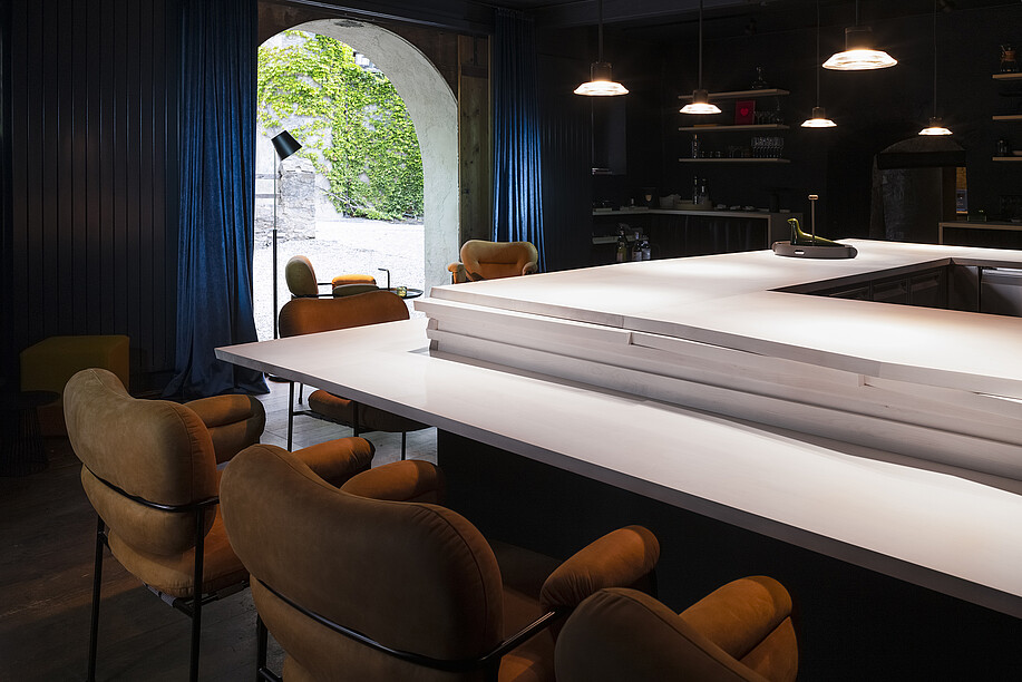 Der Raum selbst ist wie ein edles Wohnzimmer mit offener Küche konzipiert. Zentrales Element ist der massive Tresen aus Berg-Ahorn, um den zehn ausladende Armlehnstühle aus hellem Leder zum bequemen Verweilen gruppiert sind. Jeder Platz erlaubt dem Gast einen uneingeschränkten Blick auf das Geschehen am Küchenblock – und auf die gekonnten Handgriffe von Küchenchef Timo Fritsche. Für einen besonders persönlichen Service betraute Andreas Caminada mit Giuseppe Lo Vasco einen erfahrenen Restaurantleiter und Sommelier: Der 29-Jährige mit Wurzeln in Sizilien und Apulien gehört seit Jahren zum Team und hat sein Gespür für die Gäste zuvor im «Schloss Schauenstein» sowie im St. Moritzer «IGNIV»-Ableger seines Chefs unter Beweis gestellt.