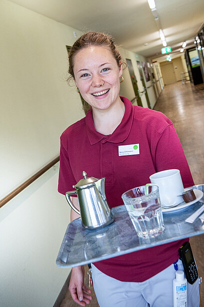 Eine zentrale Rolle nimmt dabei die Verköstigung ein. Beliebter Treffpunkt bei sämtlichen Bewohnern ist die öffentliche Cafeteria, die rund 20 Plätze im Innern zählt und gleichzeitig auf ihrer einladenden Terrasse mit Blick auf den Zugersee weitere 50 Plätze bietet. Ein eingespieltes Küchenteam sorgt mit Freude und Kreativität für eine ausgewogene und gutbürgerliche Verpflegung. Das fängt bei einem grosszügigen Frühstücksangebot an und endet bei verschiedenen Auswahlmöglichkeiten beim Mittag- und Abendessen. «Unsere Bewohnenden werden jeden Tag aufs Neue gefragt, was sie sich zum Essen wünschen und müssen nicht einfach zwischen Menu A oder B auswählen», erklärt Beatrice Mathys. Dabei steht es den Bewohnenden frei, ob sie im Speisesaal oder auf der Etage essen wollen. «Und wenn eine Bewohnerin mitten in der Nacht Lust auf einen Kaffee hat, dann soll sie ihn kriegen. Auch ein Konfibrötli zwischendurch muss möglich sein», betont die Heimleiterin und begründet damit, weshalb jede Etage ihre eigene kleine Küche hat. Denn Beatrice Mathys sind effiziente Betriebsabläufe wichtig. «Wir haben ein fünfstöckiges Haus. Es wäre alles andere als effizient, wenn die Nachtwache für solche Wünsche durchs ganze Haus in die Küche ins Parterre laufen müsste. Deshalb sind die Etagen für die Verpflegung entsprechend eingerichtet.» Und dazu gehören auch eine qualitativ hochstehende Kaffeemaschine samt Heisswasser-Ausschankgeräten. «Wir möchten unseren Bewohnenden einen rund um die Uhr anständigen Kaffee servieren können und setzen deshalb Bohnenkaffee voraus.»