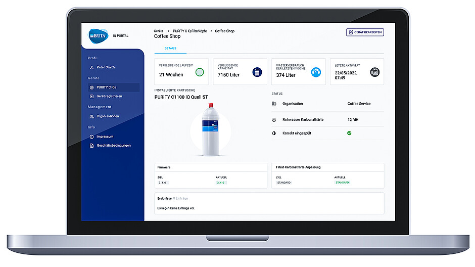 - Der Filterstatus der vorhandenen Kartuschen wird jederzeit transparent im Brita iQ-Portal aufgezeigt, sodass die Service-Einsätze optimal geplant werden können.
