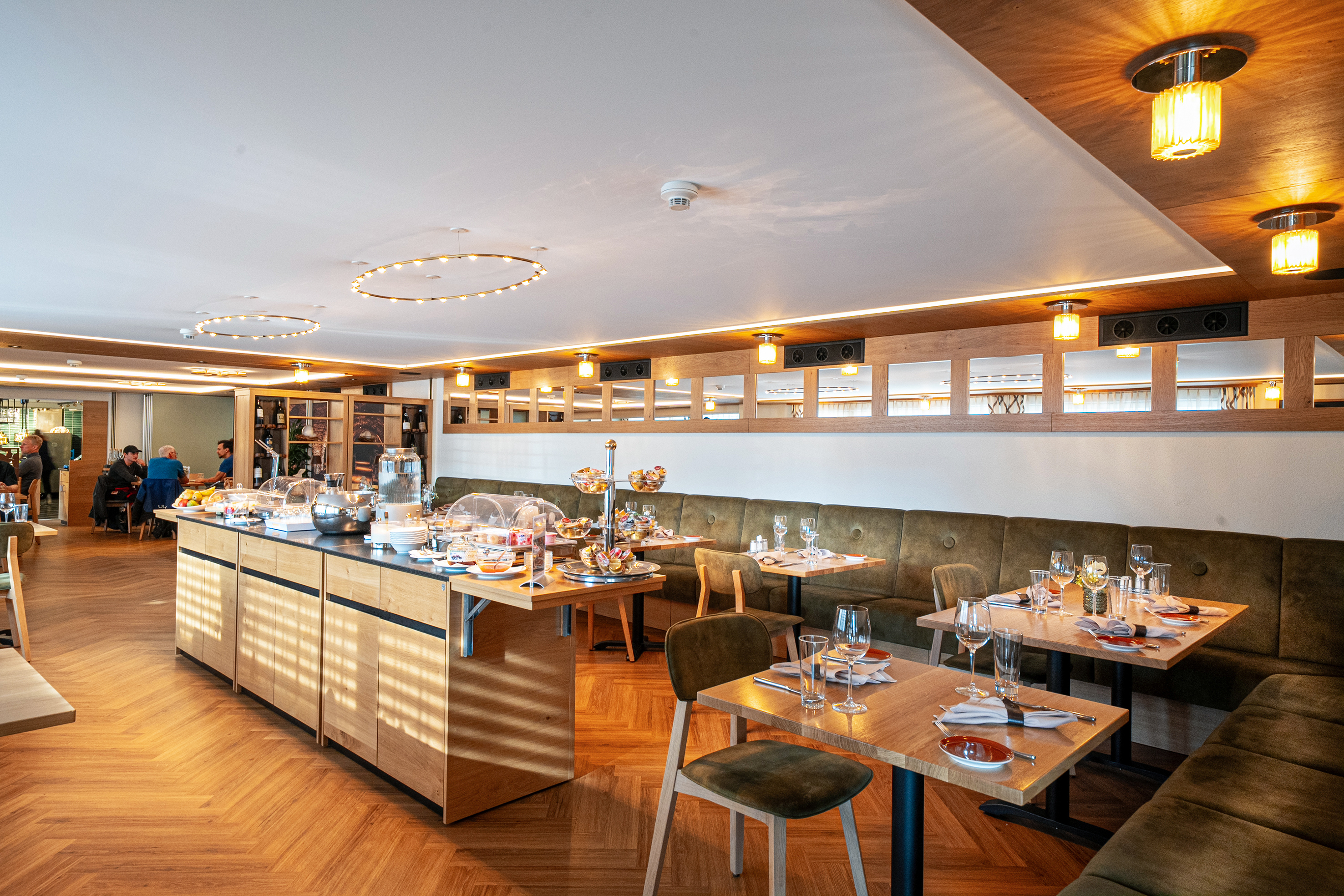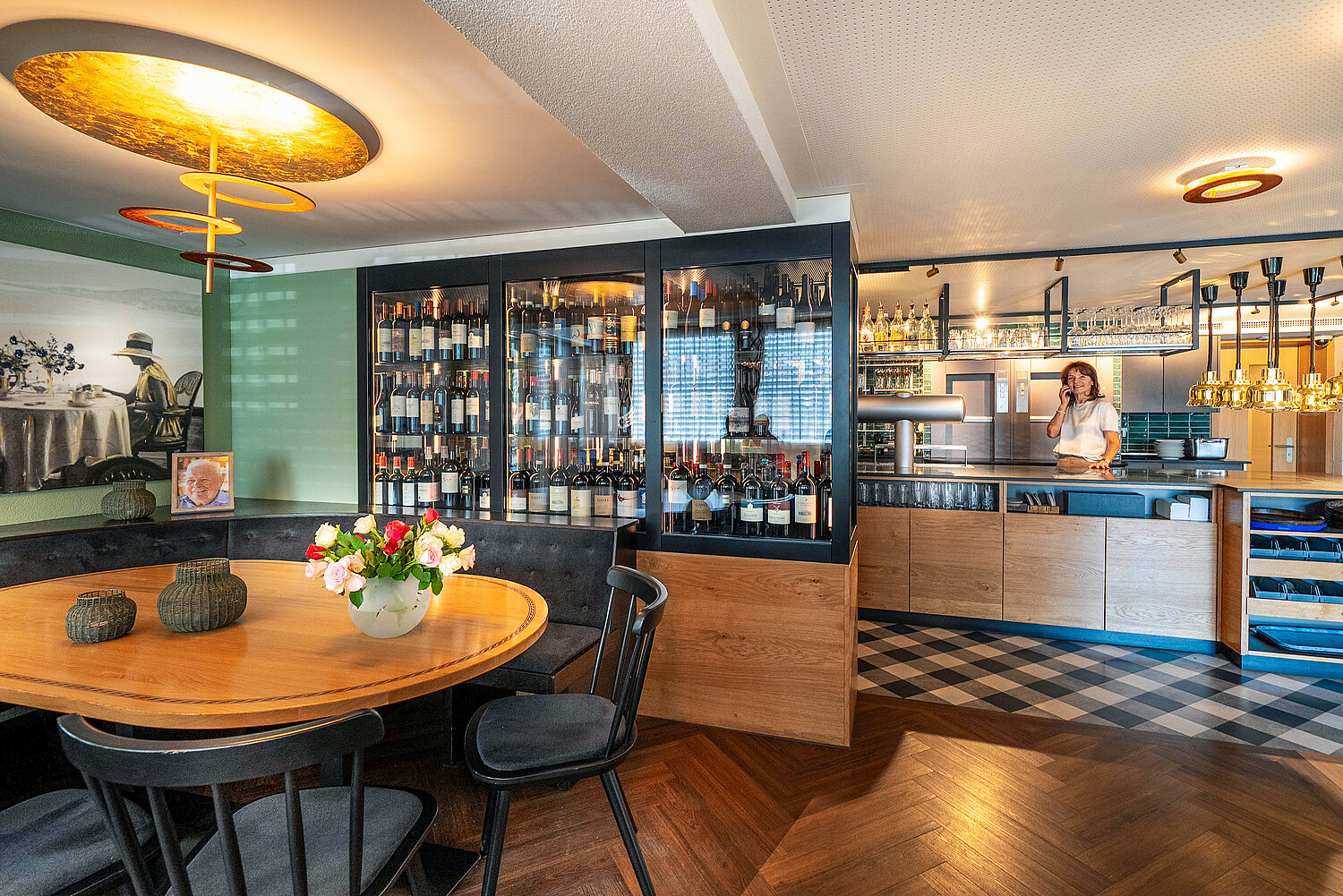 Die weissen Flächen bringen ausserdem mehr Helligkeit in den Raum und lösen zugleich ein anderes Problem: Vor der Erneuerung befand sich im Restaurant ein Steinboden, die Decken bestanden durchgehend aus Holz. Der Schall wurde durch diese Materialien stark reflektiert und der Lärmpegel war entsprechend hoch. «Die weissen Flächen sind Schallschluck-Textildecken», erklärt Hans Brönnimann. «So kann man sich unterhalten, ohne dass jedes Wort bis zum nächsten Tisch reicht.» Zusammen mit dem hellen Parkettboden und dem frischen Beleuchtungskonzept habe man Räume schaffen können, die zeitgemäss sind «und von der Stimmung her sehr viel bieten», sagt Hans Brönnimann.