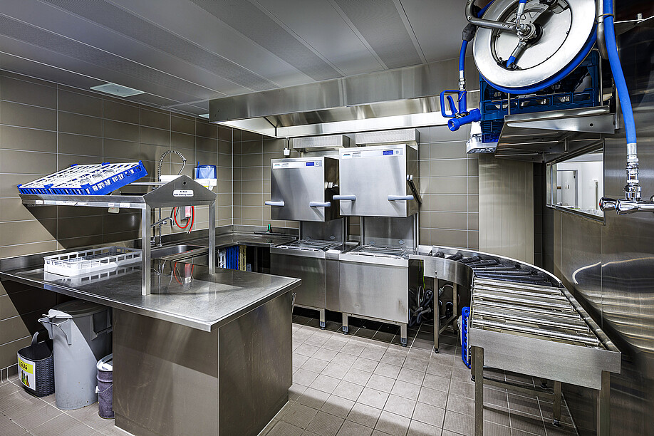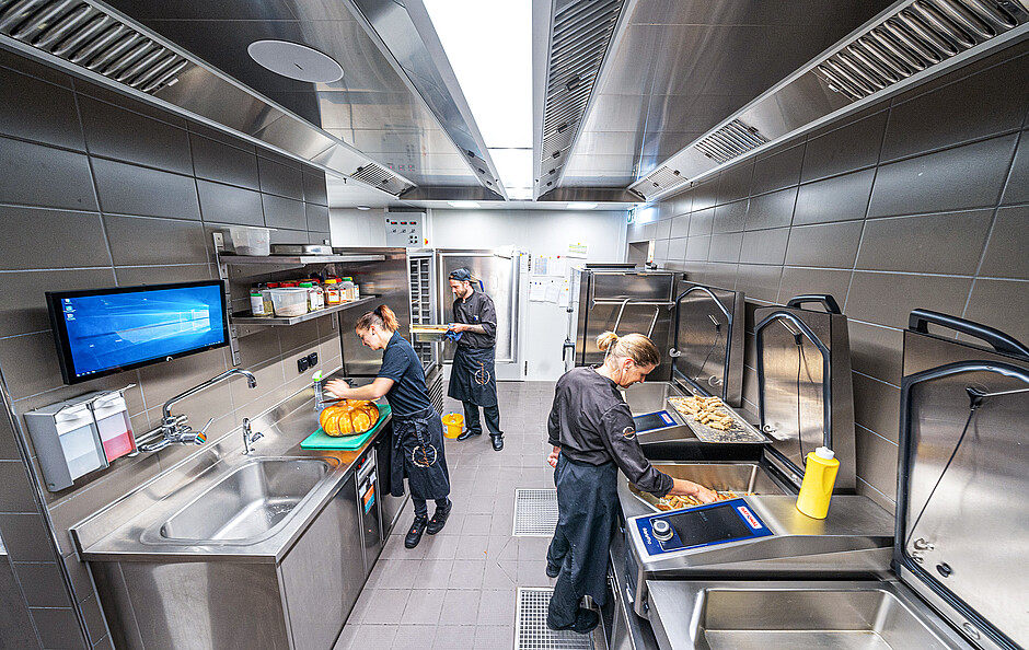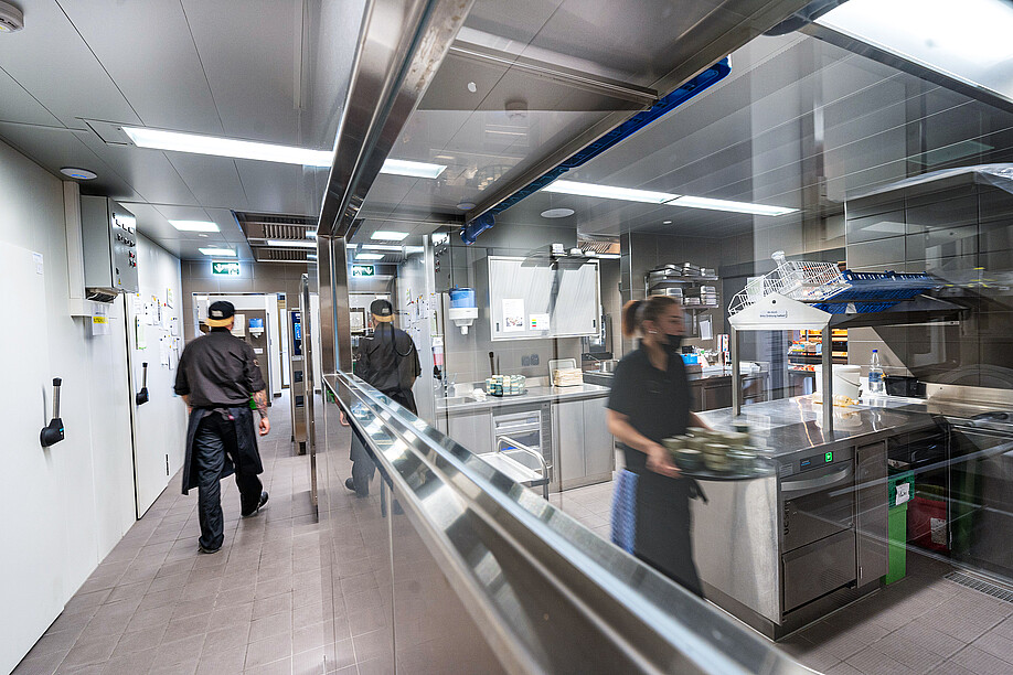 Es ist ein volatiles Geschäftsmodell, das einen effizienten und flexiblen Betrieb in der Küche erfordert mit einem Team, das neu zusammengewürfelt, sich erst einmal finden muss. Fünf Köche und zwei Hilfsköche sowie eine Mitarbeiterin der Sozial-Stiftung Brändi bilden das Küchenteam, das sich auf eine grosszügige, professionell ausgestattete Küche stützen kann, welche die Aeschlimann Hotelbedarf AG geplant und realisiert hat. Eine Sichttüre markiert den Übergang in die Küche, die mit einer durchdachten und gut ausgerüsteten Produktionslinie beginnt. «Hier ist die Vorbereitung für Bankette für 300 Personen problemlos möglich. Wird vorproduziert, könnten täglich 600 bis 700 Mahlzeiten und Menus zubereitet werden», erklärt Markus Aeschlimann.