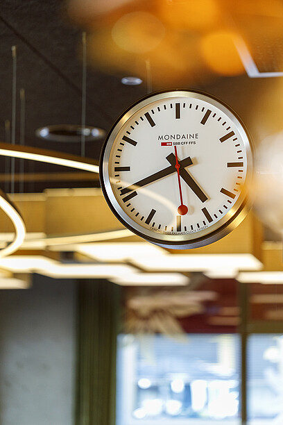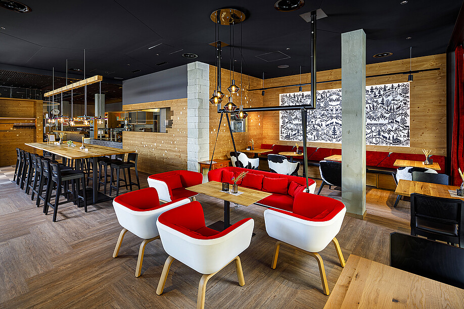 Die beck konzept ag bringt Traditionelles mit Modernem zusammen und setzt mit Sesseln mit Kuhfellbezug oder einer rot-weissen Hollywood-Schaukel das typisch Schweizerische auf der Farb- und Materialebene fort. Zwischenwände aus Fichten- und Tischplatten aus Eichenholz sorgen für einen urbanen Chalet-Charme. Ein Vinylboden geht in einen Plattenboden aus Feinsteinzeug über, der je nach Blickwinkel dreidimensional erscheint. Diesen Übergang wiederholt die textile Spanndecke im Wechsel zur funktionalen Streckmetalldecke und grenzt Lounge und Bistro-Teil vom Restaurant-Bereich dezent ab. Insgesamt hat die beck konzept ag ein beeindruckendes Ambiente geschaffen, das erst noch nach den Regeln von Feng-Shui gestaltet ist.
