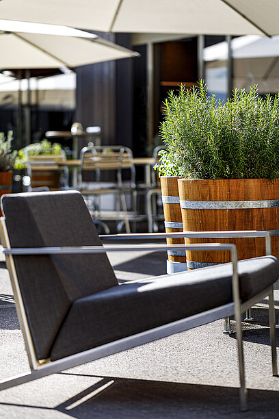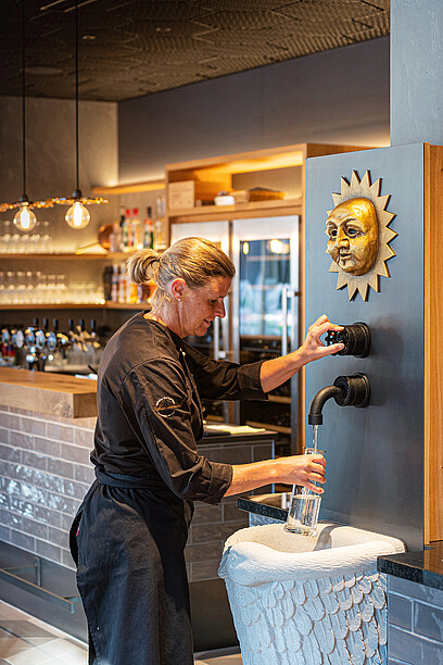 «Aus dem Brunnen fliesst energetisiertes und gekühltes Wasser, das die Gäste kostenlos in ihre Gläser und Krüge füllen dürfen», sagt Heike Klopfer, stellvertretende Geschäftsführerin, die mit ihrem Lebenspartner Damian Sidler das Logo des Restaurants selbst entworfen hat. «Er hat den Blumenkranz gezeichnet, der seine starke Verbundenheit mit der Natur symbolisiert. Den unteren Teil des Kreises bildet der Stempel eines Weinglases, den der Wein zeichnet, wenn ein paar Tropfen an Bauch und Stiel herabrinnen und feine Kreise auf Tischtüchern und Oberflächen hinterlassen.»