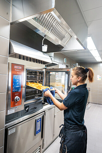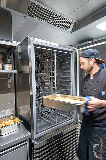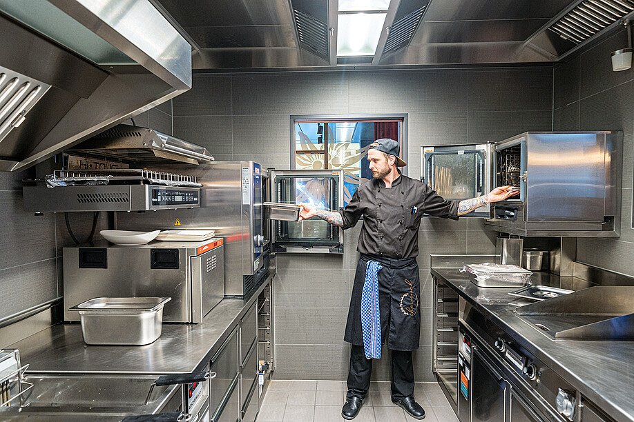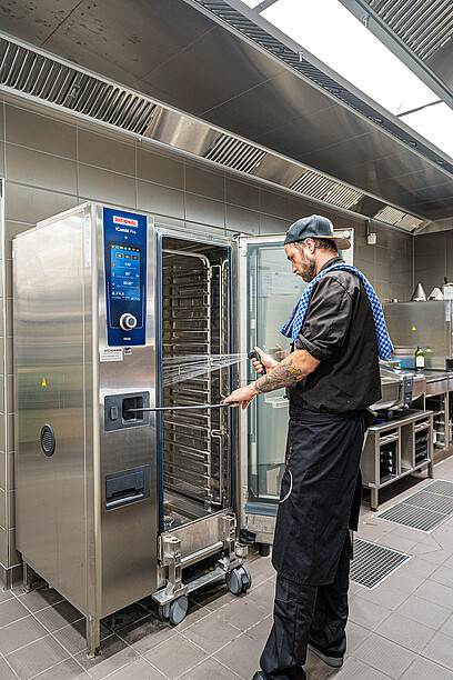 «Ich verwende ihn vor allem zum Regenerieren von Reis, Kartoffelgratin oder Kartoffelstock. Abends produzieren wir darin unsere Cordon-Bleus. Dazu stellen wir die Kerntemperatur auf 64 Grad ein und entnehmen sie in der immer gleichen Qualität, egal, ob das eine Stück dicker, das andere etwas dünner ist oder die Garraumtüre zu lange offen war. Dank seiner Intelligenz reagiert das Gerät dynamisch auf solche Anforderungen. Kennt es das gewünschte Ergebnis, adaptiert es Feuchtigkeit, Luftgeschwindigkeit und Temperatur automatisch. Das ist wirklich beeindruckend und verschafft mehr Zeit für anderes», betont Chefkoch Nicolai Berger die Vielseitigkeit des iCombi Pro.