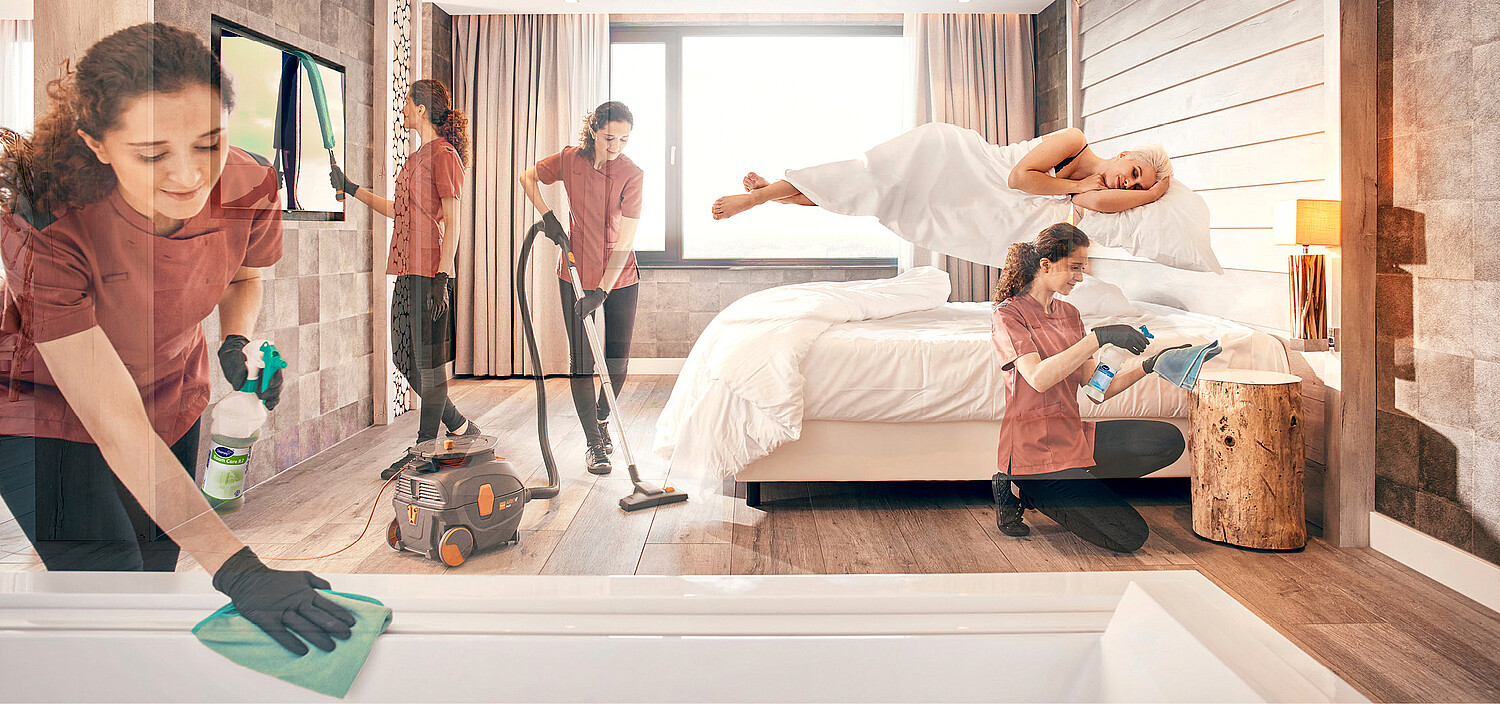 Die Reinigung im Hotel steht fast immer im Spannungsfeld zwischen Zeitdruck und Qualität, daher ist es umso wichtiger, die richtigen Produkte, standardisierte Abläufe und gut geschultes Personal zu haben.
