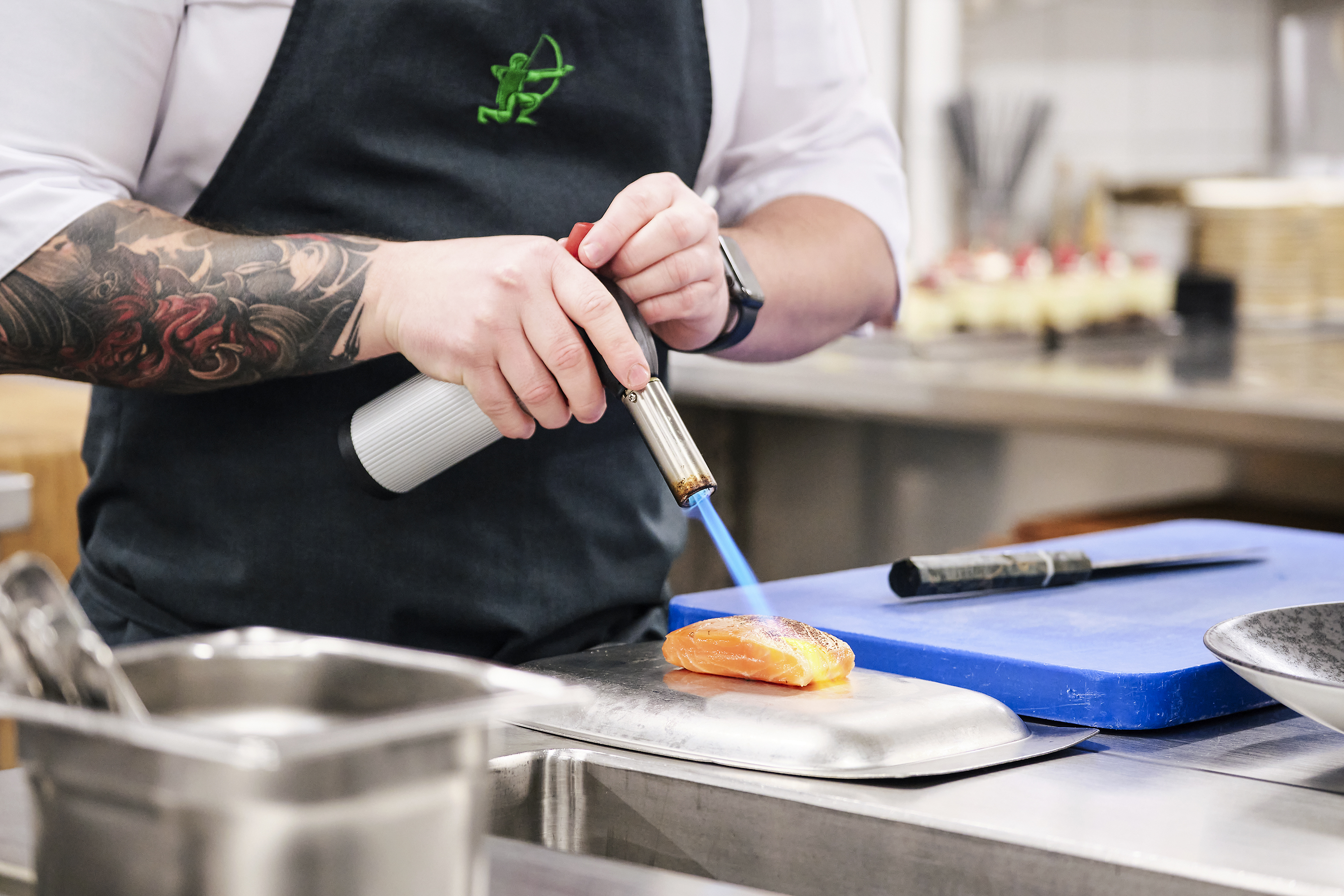 Beim Einkauf seiner Waren setzt Peter Brežina auf Qualität. Natürlich müsse auch der Preis stimmen und die Kalkulation am Schluss aufgehen, aber: «Erstklassige Produkte stehen an oberster Stelle.» Dieses Verhältnis stimmt bei Dyhrberg und so kommt es nicht von ungefähr, dass der erfahrene Koch seinen Lachs bei der Dyhrberg AG bestellt. Das Solothurner Unternehmen aus Balsthal, gegründet 1965, ist die erste Lachsräucherei der Schweiz. Es importiert die Edelfische aus nachhaltigen Fischereien und Aquakulturen, bevor sie in der eigenen Räucherei nach traditioneller Methode im Holzofen veredelt werden.