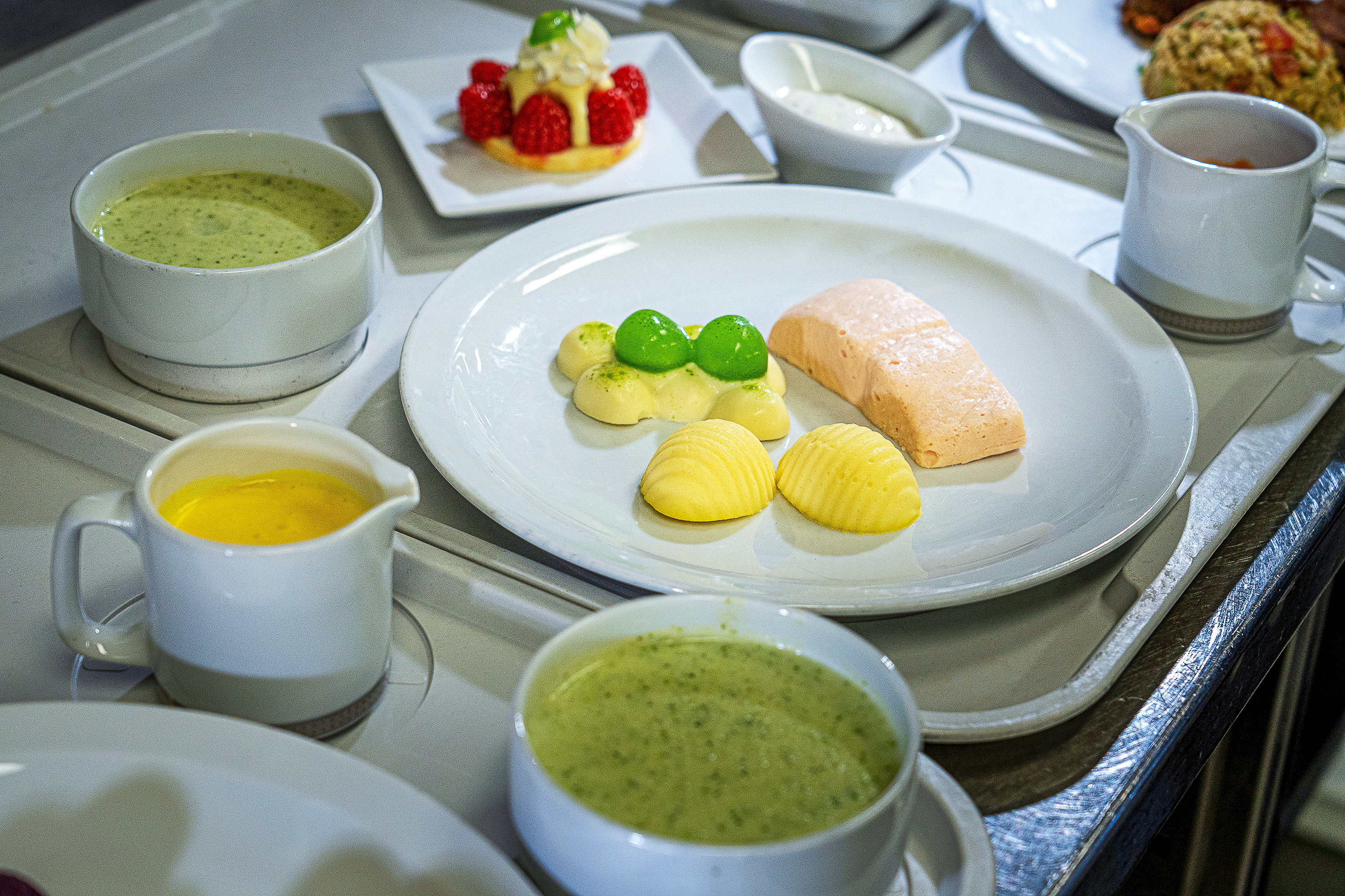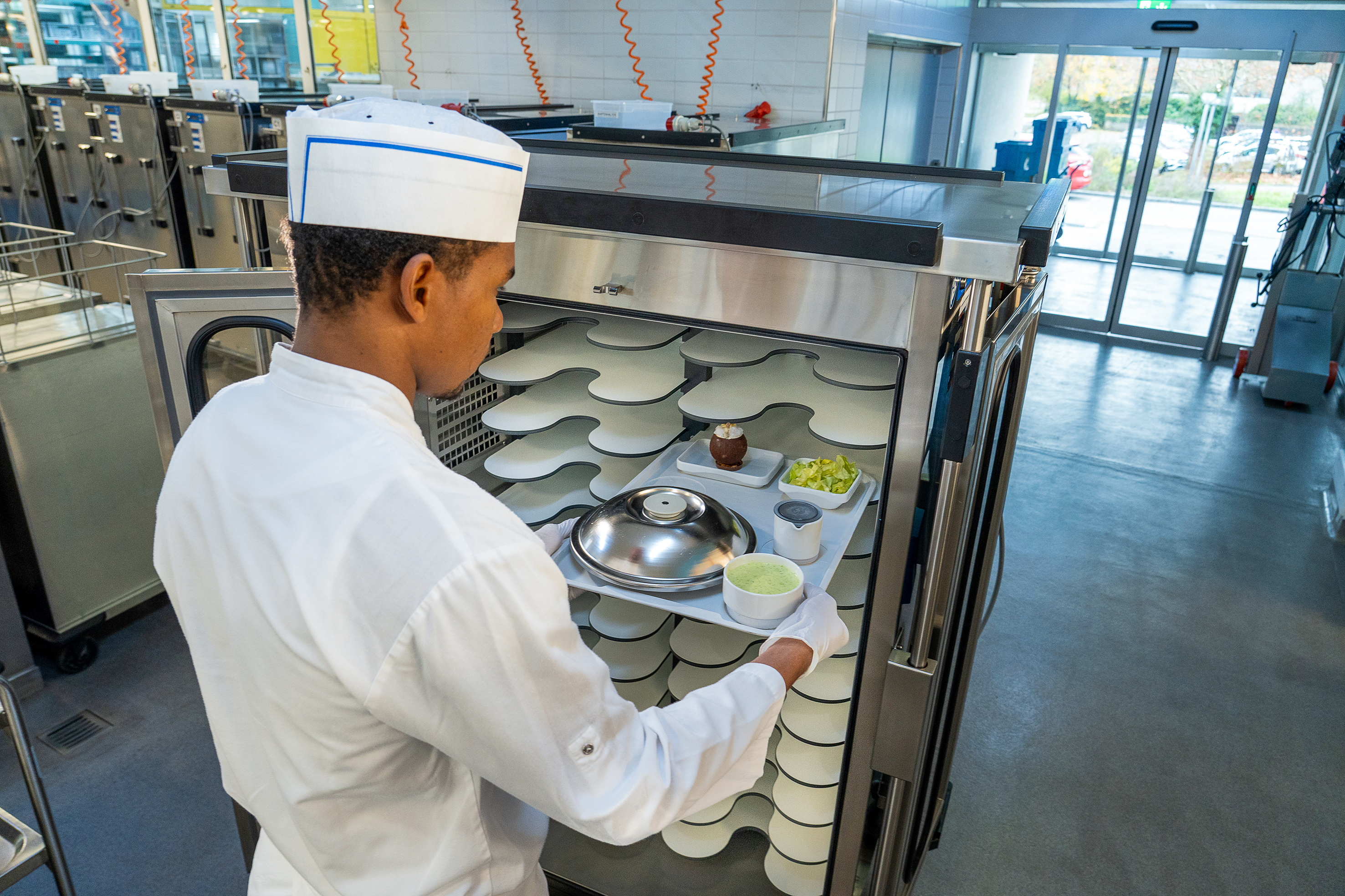 Dadurch gibt es keine heissen Tabletts mehr und Energie wird gespart. Vom Speisenportionierband werden die Tabletts in die Induktionsspeisewagen geschoben, wobei die Porzellanteile exakt über den Induktionsspulen im Induktions-Transportwagen liegen und so eine gleichmässige, optimale Temperatur der unterschiedlichen Geschirrteile vom Rand bis in die Tellermitte gewährleistet ist. Dank dem «Clima-Control-System», der intelligenten Kühltechnik, werden die Kaltspeisen während der Regeneration nicht erwärmt und die geforderten Kalttemperaturen ohne Raumtrennung gehalten. Die Induktionstechnik regeneriert die Speisen besonders schonend, gleichmässig und punktgenau. Geschmack, Optik, Nährstoffe und Vitamine bleiben dadurch optimal erhalten.