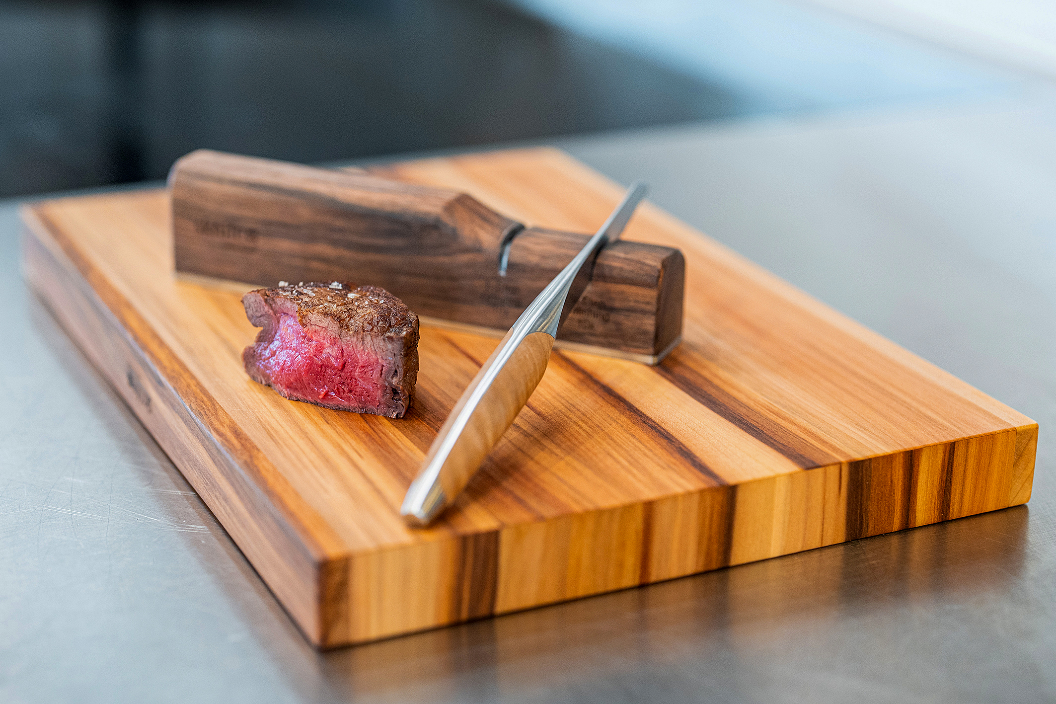 Das Design des Steakmessers wurde in Zusammenarbeit mit renommierten Schweizer Spitzenköchen entwickelt und zeichnet sich durch eine berührungslose Schnittkante, eine perfekte Gewichtsverteilung und eine elegante Formgebung aus. Der erste Prototyp wurde anhand von Zeichnungen des befreundeten Messerschmieds Hansjörg Kilchenmann in Basel aus rohem Stahl gefertigt.