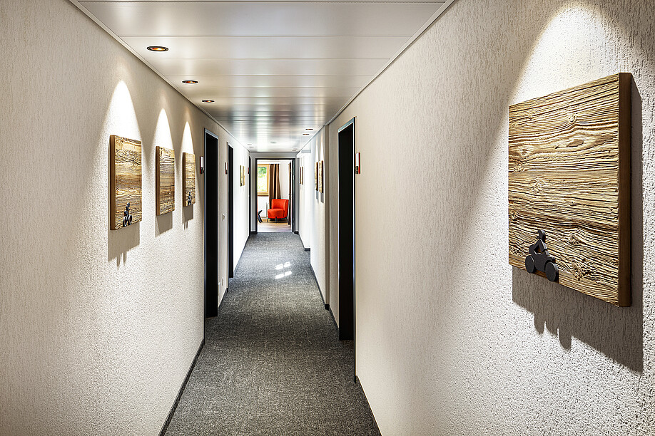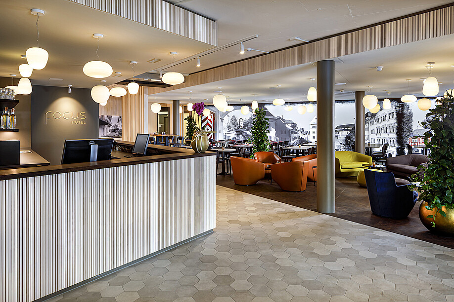 Stichwort Materialisierung: beck konzept legt ein zentrales Augenmerk auf die Materialien, welche sich in die jeweilige Umgebung einfügen und den Betrieb widerspiegeln. Dabei nutzen die Fachleute den Spielraum gewisser Elemente aus, indem beispielsweise ein Steinboden im Holzlook in einem Eingangsbereich eines Sporthotels eingesetzt wird, um den Gästen mit ihren harten Skischuhen gerecht zu werden, der aber dennoch gewisse Wärme ausstrahlt. Eine Spanndecke wird eingesetzt, wenn es darum geht, den Lärm und Schall in einem Raum zu dämmen und dem Gast ein wohliges Gefühl zu vermitteln. Die beck konzept ag setzt Materialien flexibel ein – je nach Situation und Erfordernissen. «Dabei achten wir auf ein vernünftiges Preis-/Leistungsverhältnis. Unsere Ziele sind stets kreative und finanzierbare Lösungen», erklärt Roland Walker. Für die Materialisierung greift der Gesamtanbieter aus dem luzernischen Buttisholz grösstenteils auf Produkte aus der Schweiz oder dem nahen Ausland zurück. Im vor wenigen Jahren geschaffenen HAPTIK-Kompetenzzentrum in Buttisholz beherbergt beck konzept weit über 6 000 Materialien, die für die Bemusterung zu Rate gezogen werden können. Die Kunden können hier die verschiedensten Materialien erleben, sie betrachten, fühlen und vergleichen. «Unser HAPTIK-Center ist bei Hoteliers sehr beliebt. Im Gegensatz zu einem Restaurant hat der Hotelier nur bedingt eine fixe Vorstellung, wie er sich ein Gästezimmer vorstellt. Das kommt davon, dass er sich seltener in einem Hotelzimmer aufhält, im Gegensatz zum Restaurant, wo er genau weiss, was er sich wie wünscht», erläutert Roland Walker. Das HAPTIK-Kompetenzzentrum ermöglicht es den Fachleuten, diverse Muster zu präsentieren und so schneller und einfacher auf das gewünschte Ergebnis zu kommen.