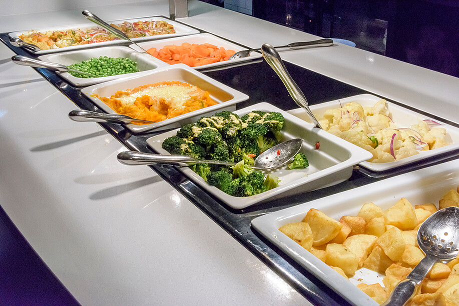 Alternativ präsentiert: Statt in Wannen lassen sich Kartoffelgratin, Gemüse und Fischcurry auch in Keramikschalen anrichten.