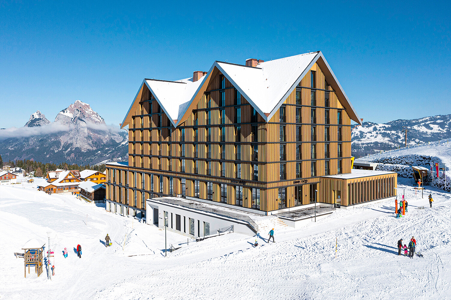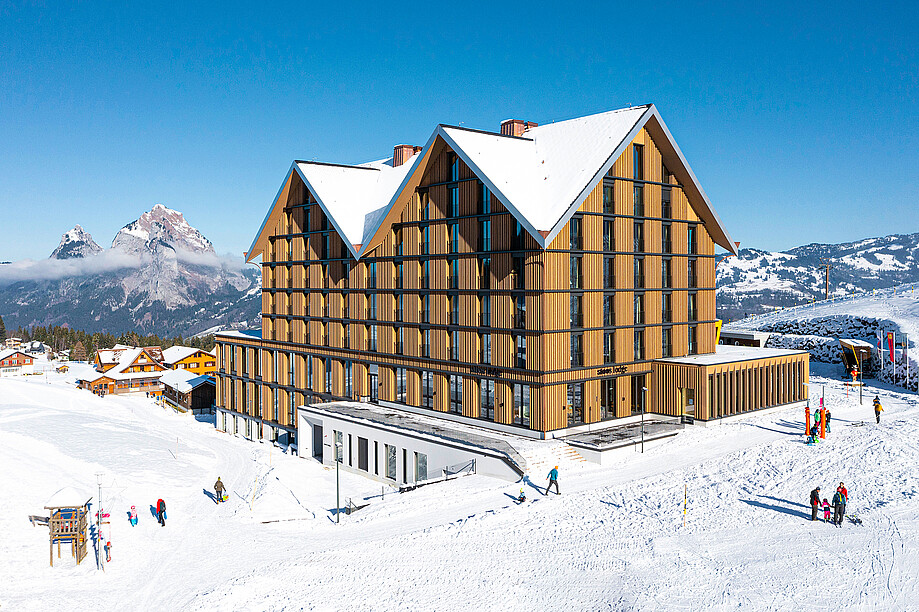 Mit dem Neubau der Standseilbahn wurde das Zentralschweizer Ausflugsziel in ein neues Licht gerückt. Das autofreie Bergdorf ist seither ein noch beliebteres Ausflugs- und Ferienziel für Familien, Wanderer und Skifahrende. Fünf Jahre nach Inbetriebnahme der Rekordbahn erhielt das Ausflugsziel eine weitere touristische Attraktion: das Designhotel Stoos Lodge. Gemeinsam mit der Bergstation verleiht es dem Dorf das neue Zentrum und erweitert das Beherbergungs- und Dienstleistungsangebot massgeblich. Rund zehn Jahre Planungs- und Bauzeit stecken hinter dem eindrücklichen Holzbau, der Mitte Dezember 2022 eröffnet wurde. Durch die oberirdischen Geschosse und die zwei teilweise hervorstehenden Untergeschosse ist die Stoos Lodge unübersehbar, seine vollständige Holzfassade – über 80 Prozent des verwendeten Holzes stammen aus dem nahen Schwyzer Wald – passt sich jedoch optimal in die Umgebung ein.